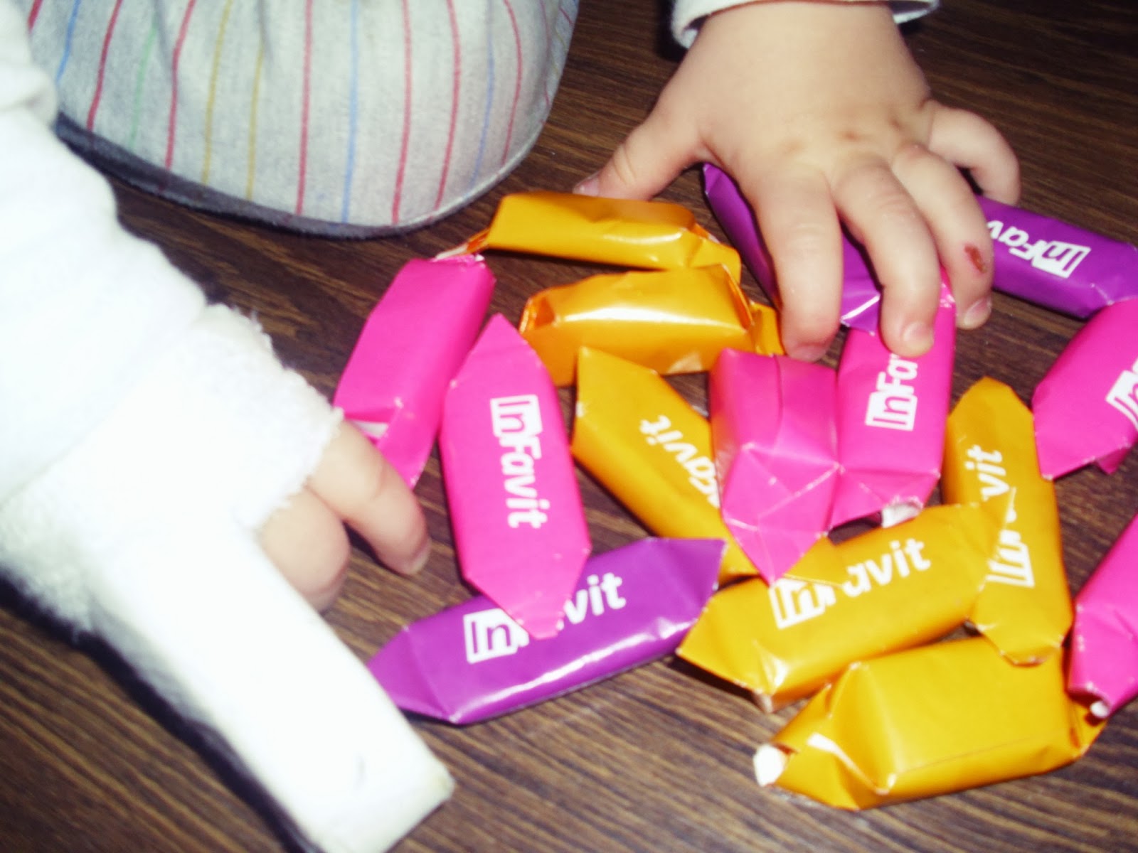 Słyszeliście o VitaPiratach? O tym, że dzieciaczki uwielbiają słodkości wiadomo nie od dziś i niczego nowego teraz nie odkryłam. Dlaczego, więc nie podawać dzieciom witamin, właśnie podczas jedzenia tak bardzo lubianych przez nie słodyczy? VitaPiraci, to lizaki z witaminami – czyli kolejna świetna alternatywa dla tradycyjnych posiłków bogatych, w witaminy które dzieci jedzą czasem mniej chętnie. Lizaczki są suplementem diety o smaku owocowym, w którym znajdują się między innymi takie witaminy jak : K, B, C, D oraz kwas foliowy. A co na to Kubuś? Oczywiście zachwycony był lizakiem, a ja byłam spokojna o to, że nie przyswaja on pustych substancji. W paczuszce otrzymaliśmy również InFavitowe krówki, co prawda nie wiem, czy one również zawierają witaminy, ale są… Przepyszne! Dużą zaletą produktów InFavit Baby jest również fakt, że naprawdę kosztują niewiele, dzięki czemu nie są dostępne tylko dla nielicznych. Myślę, że wydanie kilku złotych na kropelki nie jest jakimś strasznym wydatkiem. Marka InFarnacja posiada w swoim asortymencie nie tylko produkty dla najmłodszych, ale i dla kobiet w ciąży, oraz karmiących piersią.