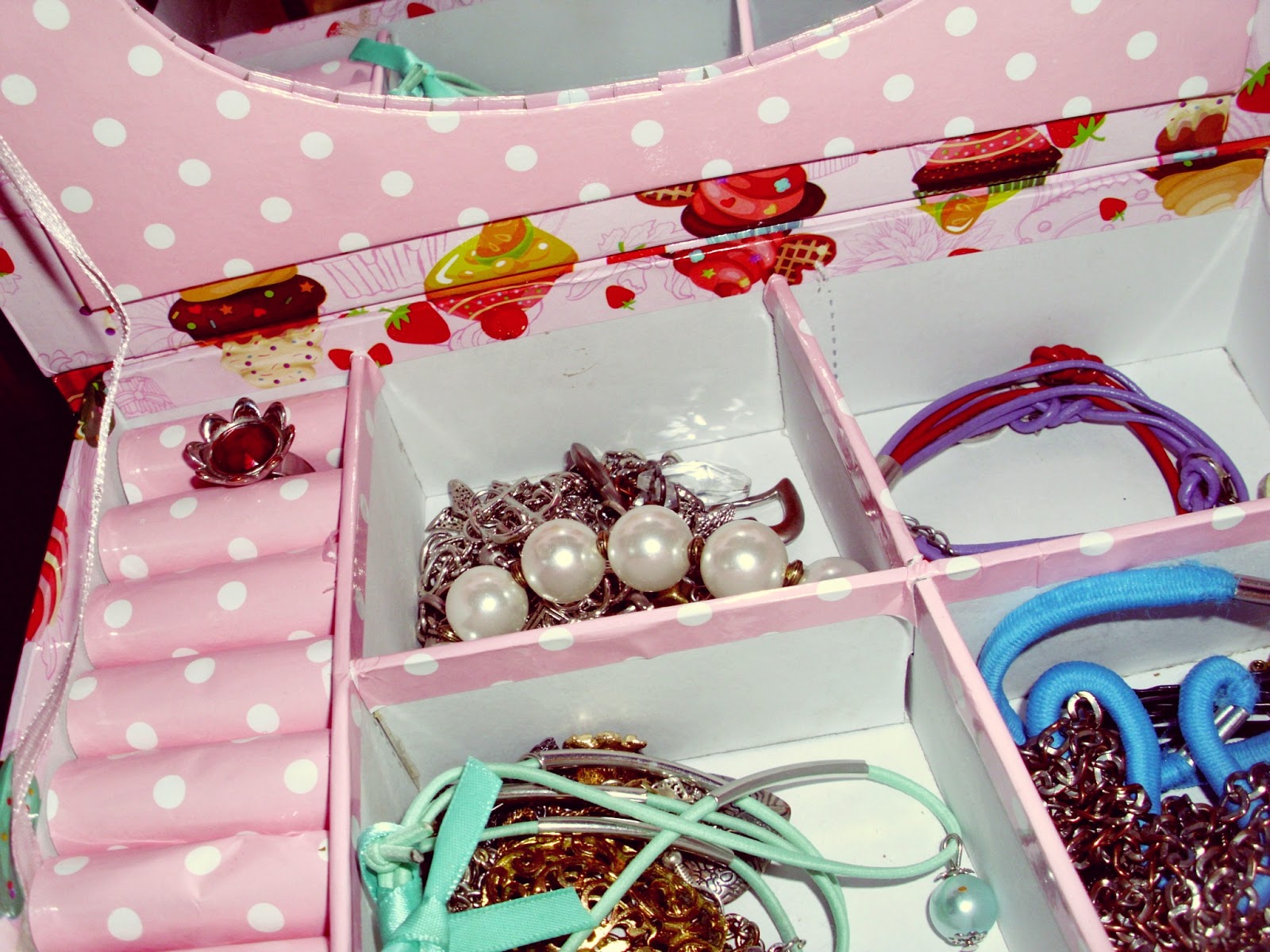 My zabawki trzymamy w wielkiej drewnianej skrzyni zrobionej przez dziadka chłopców ze starych mebli,biżuterie swoją w metalowej puszce którą Mąż mi kupił ostatnio w Biedronce ( zestaw 3szt ok 19 zł),kosmetyki takie na już czyli jakiś krem do rąk czy balsam lub krem do buzi w pudełku po butach które jest tak ładne że szkoda wyrzucać :)