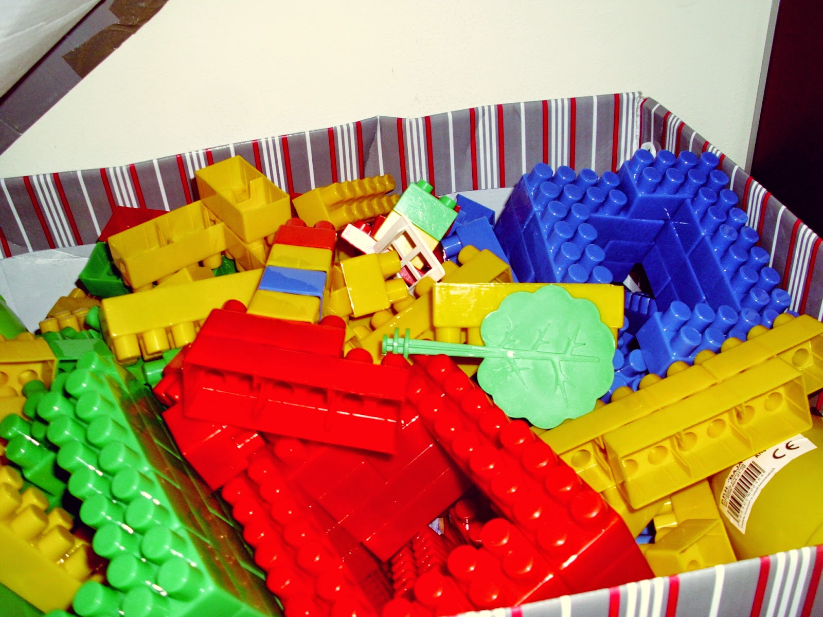 W czym trzymacie klocki? Oryginalne pudełka, jakieś worki, czy co? Mam z nimi problem, spory. Pisałam Wam o tym, że mój tata zamówił Kubie na wielkanoc worek klocków. Ostatecznie wyszło około 400 sztuk (!!!), o ile mnie pamięć nie myli- i to nie tych malutkich, a normalnych dużych klocków, nieco większych od DUPLO. Kurier dotaszczył ogromny karton, w którym znajdował się plastikowy worek z klockami, związany fajnym sznurem. Wszystko byłoby super, gdyby nie fakt, że worek był rozerwany, więc nie mogłam w nim trzymać klocków. Pierwszą noc spędziły więc w kartonie, w którym przyjechały, a następnego dnia udałam się z Kubą i rodzicami do PEPCO, w poszukiwaniu dużego, plastikowego pudła. Wzięliśmy największe- pewni, że wszystkie klocki się tam zmieszczą. Och, my naiwni. W plastikowym, dużym pudełku zmieściły się 2/3 klocków. Co z resztą? Trochę wpadło do pudełka z Lego, a pozostałe do kufra z zabawkami. Ale drażniło mnie to, nie lubię tak. Chociaż nie przeszkadza mi powierzchowny bałagan i często z czystego lenistwa przymykam na niego oko- mam bzika na punkcie układania zabawek. Dla niektórych zostawiłam nawet oryginalne kartony i po zabawie chowamy je z Kubą do środka- to w zasadzie przy zabawkach drewnianych, zawierających elementów więcej niż siedem. Dlaczego? A bo Kuba lubi wrzucać wszystko pod szafy i łóżko, a wyciąga się to dość ciężko. Ale wróćmy do klocków… Minionego wieczoru zdenerwowałam się i zrobiłam małą podmiankę. Tekturowe pudło, w którym były piżamki bez problemu pomieściło wszystkie klocki, a nawet komplet kręgli. Zaś plastikowe świetnie spisało się w przechowaniu piżamek, o czym pisałam już wyżej. Minusem jest fakt, że tekturowe pudło ledwo żyje, wystarczy, że Kuba na nie usiądzie, lub kopnie je mocniej i z pewnością połowa klocków znajdzie się na podłodze. Jakieś pomysły? Może być nawet coś DIY. W czym pomieścić te klocki?