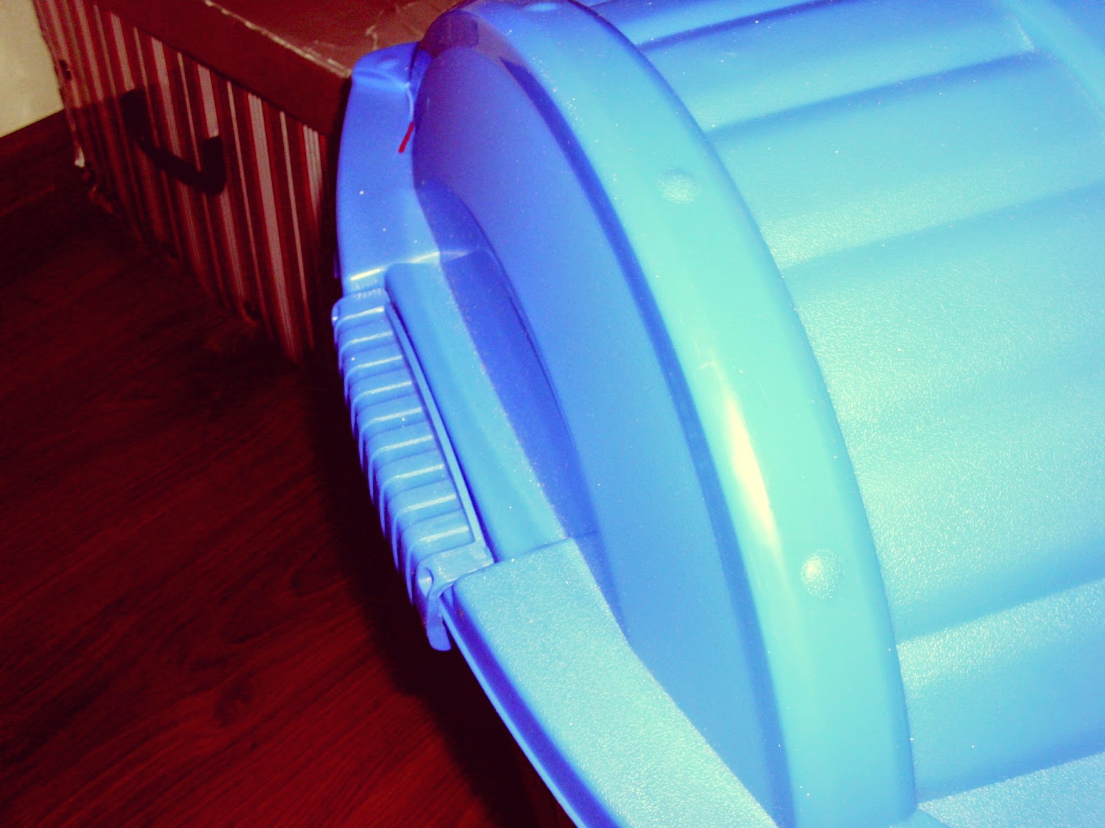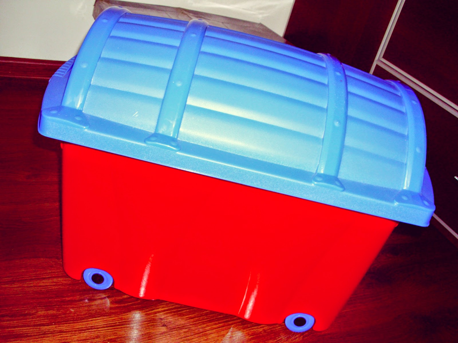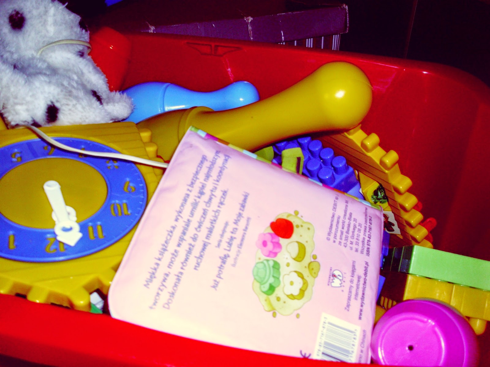Do niedawna zabawki trzymaliśmy w materiałowym koszu ze słoniem z Biedronki, który prawie rok temu dostaliśmy od Magdy. Niestety, przeżył swoje i do niczego się już nie nadawał. Zrobiłam porządek: czyli wysypałam wszystko na podłogę, wyrzuciłam zabawki popsute, których nie da się już naprawić. Grzechotki i inne, którymi Kuba się już od dawna nie bawi oddałam dla biednych. Mimo wszystko, sporo tego zostało i musiałam znaleźć dla tych rzeczy nowe miejsce. Ratunkiem na każde materialne zło jak zawsze jest PEPCO. Znalazłam tam bardzo pojemną, czerwono-niebieską skrzynię na kółkach. Kosztowała 30zł, bez grosza. Bez problemu pomieściła wszystkie zabawki. Skrzynia, czy jak kto woli kufer- otwierany jest z boku na zastrzaski, które dziecko bez większego problemu jest w stanie otworzyć. U Kuby zależy to od dnia: czasem otworzy sam, niekiedy potrzebuje mojej pomocy. Jeśli chodzi o główne pudło na zabawki- mogę odhaczyć, zrobione.