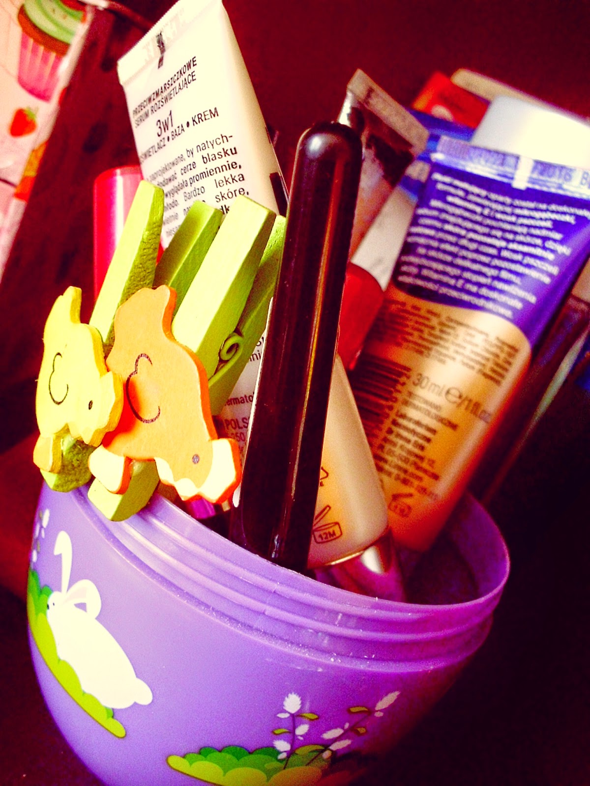Moją największą zmorą jest przechowywanie kosmetyków. Nie używam ich wielu, obecnie mieszczą się w plastikowym, fioletowym kubeczku. Fatalne rozwiązanie, na ogół wszystko muszę wysypać, kiedy mam ochotę utaplać sobie powieki jakimś cieniem. Dodatkowo- nie wygląda nazbyt ładnie. Szukam czegoś odpowiedniego, od wielu lat. Może kiedyś znajdę? Doszły mnie sluchy, że w PEPCO znajdę maleńkie koszyki wiklinowe. Z pewnością to sprawdzę!