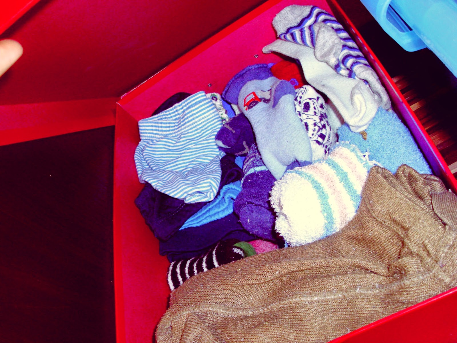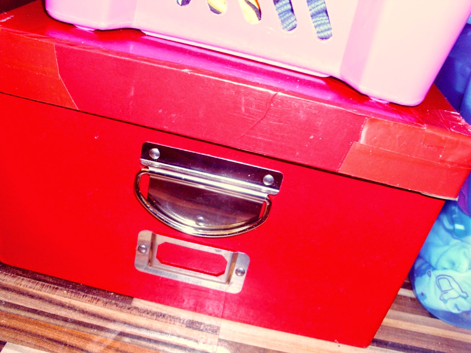 Co ze skarpetkami, majteczkami i rajstopkami? Tak, na nie też mamy pudło, czerwone. W tym przypadku tektura jest mocniejsza niż ta, z której wykonano pudełko, w którym do niedawna trzymaliśmy ubranka. Cieszy mnie to bardzo, służy nam już kilka miesięcy i ma się całkiem dobrze. Te pudło, mimo, że niemal o połowę mniejsze niż opisane powyżej- było w podobnej cenie. Pewnie ze względu na jego twardość. Warto było zainwestować. Bielizna nie lata po podłodze, nie lata po szafie, a ładnie leży w pudełku, poukładana.