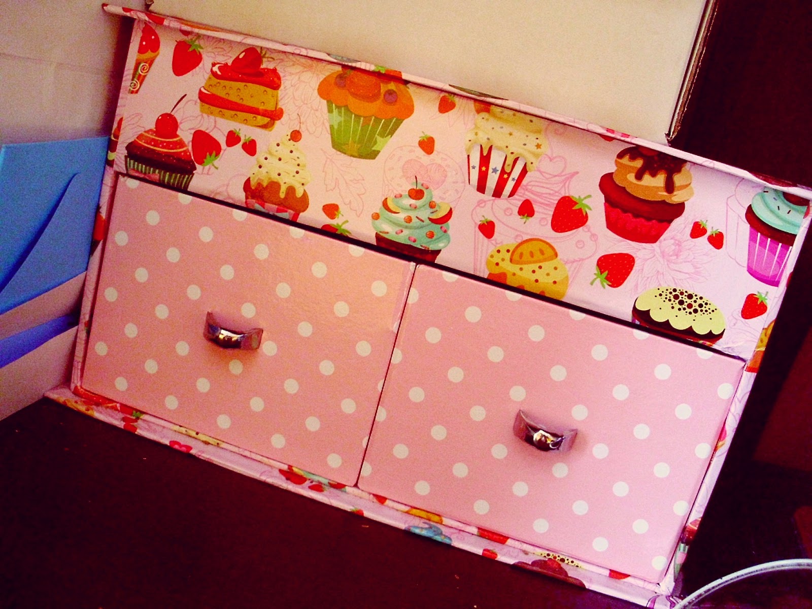 Swoją drogą, do niedawna nie zdawałam sobie sprawy, że w PEPCO można dorwać tyle fajnych pudeł. Dużych, małych, jednokolorowych i pstrokatych. Wiecie jakie pudełeczko podbiło moje serce najbardziej? Kartonowa szkatułka na biżuterię, która stoi u mnie na półce od kilku tygodni. Różowa, w kolorowe muffinki. Ma dwie szufladki, do których możemy włożyć co tylko chcemy. Ja przykładowo w jednej z nich trzymam nici i szpilki. Szkatułkę można otworzyć jeszcze od góry i znajdziemy tam osobne miejsca na poszczególną biżuterię, miejsce na pierścionki i lusterko. Mimo małych rozmiarów jest bardzo pojemna. Cena? Nie chcę skłamać, dokładnie już nie pamiętam- jednak z całą pewnością nie przekracza 25zł (bez grosza).