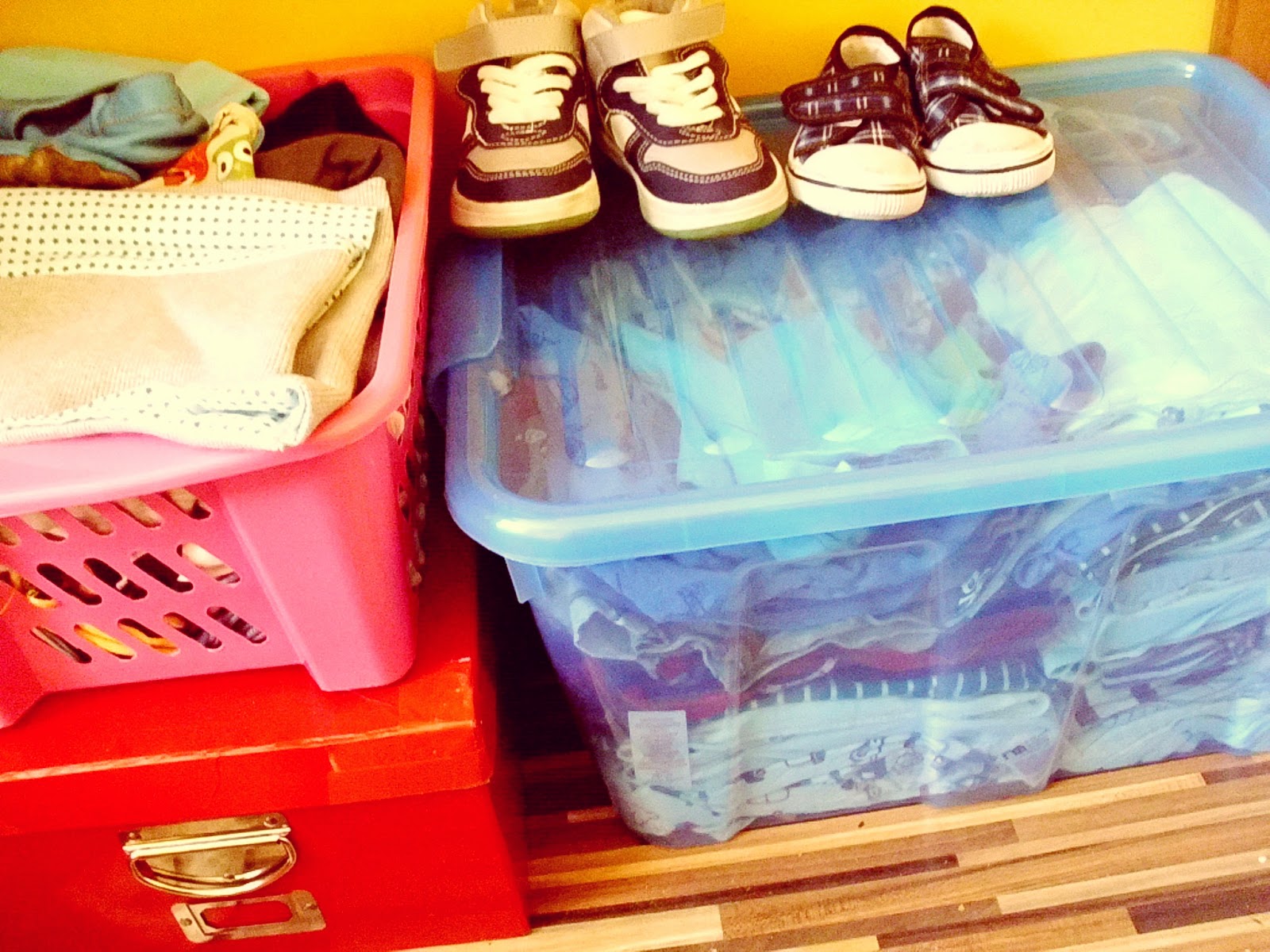 Pod łóżkiem Kuby jest cała masa pudeł. W jednym trzymam jego pamiątki, od urodzenia- jest tam pierwsze ubranko, testy ciążowe, kikut pępowinowy, opaska ze szpitala i cała masa innych rzeczy, o których opowiem Wam później. W drugim znajduje się nasza mała apteczka, która tak naprawdę wcale nie jest taka mała. Mamy sporo specyfików na różne okazje. Kurczowo pilnuję ich terminów przydatności, przeglądając je wszystkie co kilka tygodni. Jest pudło ze słodyczami z długim terminem ważności- to tak na czarną godzinę, nigdy nie wiadomo, kiedy finanse nie pozwolą mi na zakup Kubie słodkości, więc warto mieć coś w zanadrzu, kiedy nadejdą ciężkie czasy. Jest oczywiście pudełko z moimi materiałami. Gdzie je trzymam? Wykorzystałam do tego karton po boxie z pieluszkami Pampers, spisuje się świetnie.