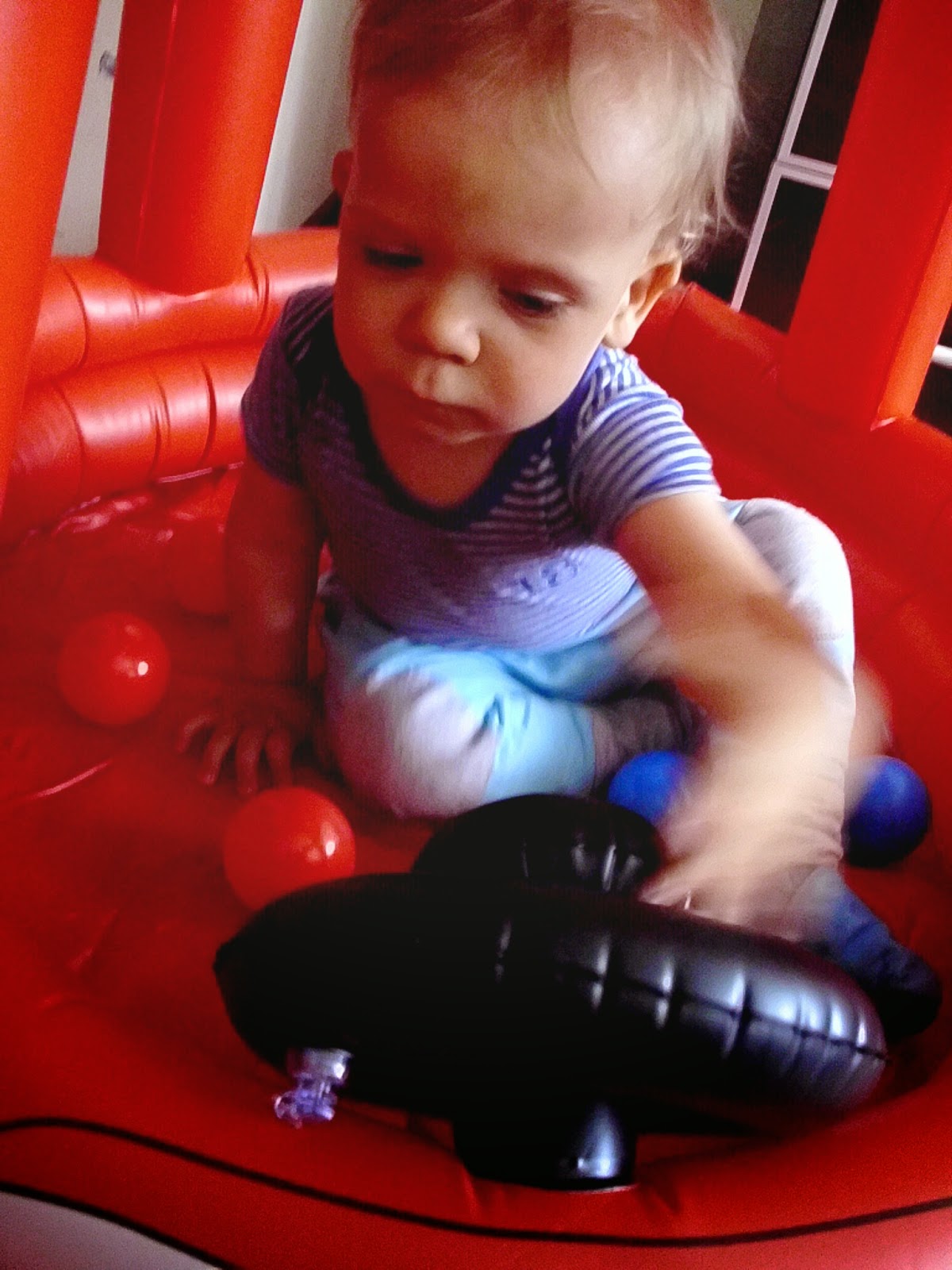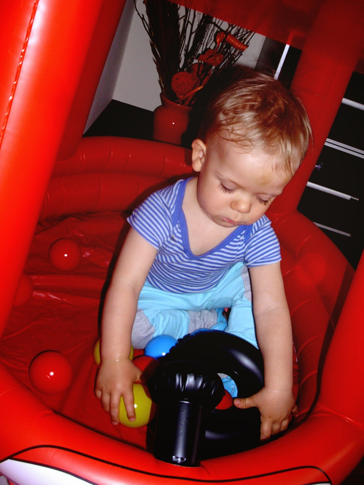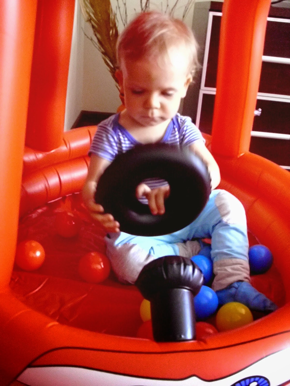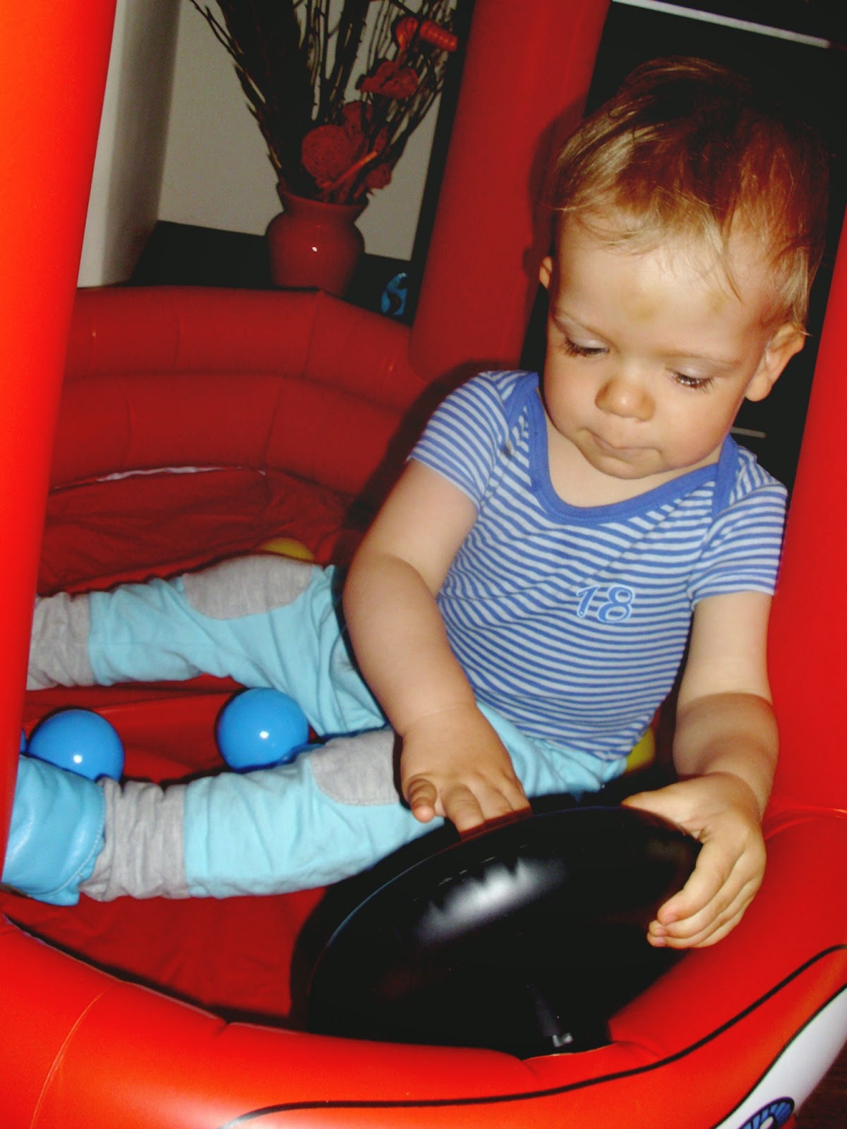 Miejsca nie mamy już wiele, a zabawki Kuby zajmują każdy wolny kąt. Dlatego świetnym rozwiązaniem okazał się dmuchany samochód (klik), którego dodatkowymi atrakcjami są piszczący klakson i plastikowe kulki. Kuba oczywiście oszalał z radości jak go zobaczył i niecierpliwie czekał, aż dziadek go napompuje. Radość była, ogromna. Oczywiście jak na złość baterie w aparacie rozładowane, więc na zdjęciach, które Wam przedstawiam nie widać już tego ogromnego uśmiechu i błyszczących oczu. Ulubionym zajęciem Kuby w aucie okazało się ściąganie dmuchanej kierownicy. Jak na kombinatora przystało- siada okrakiem na jednym z jego boków i próbuje skakać. Taki agent.