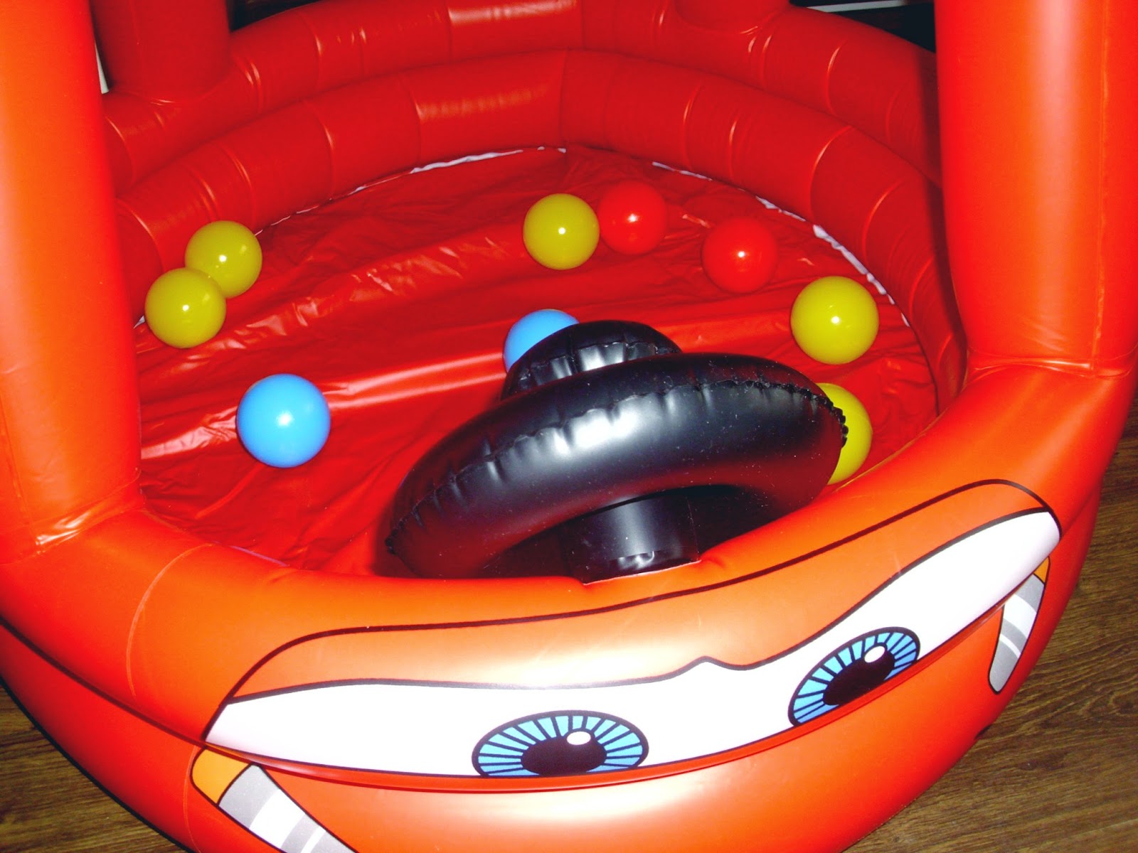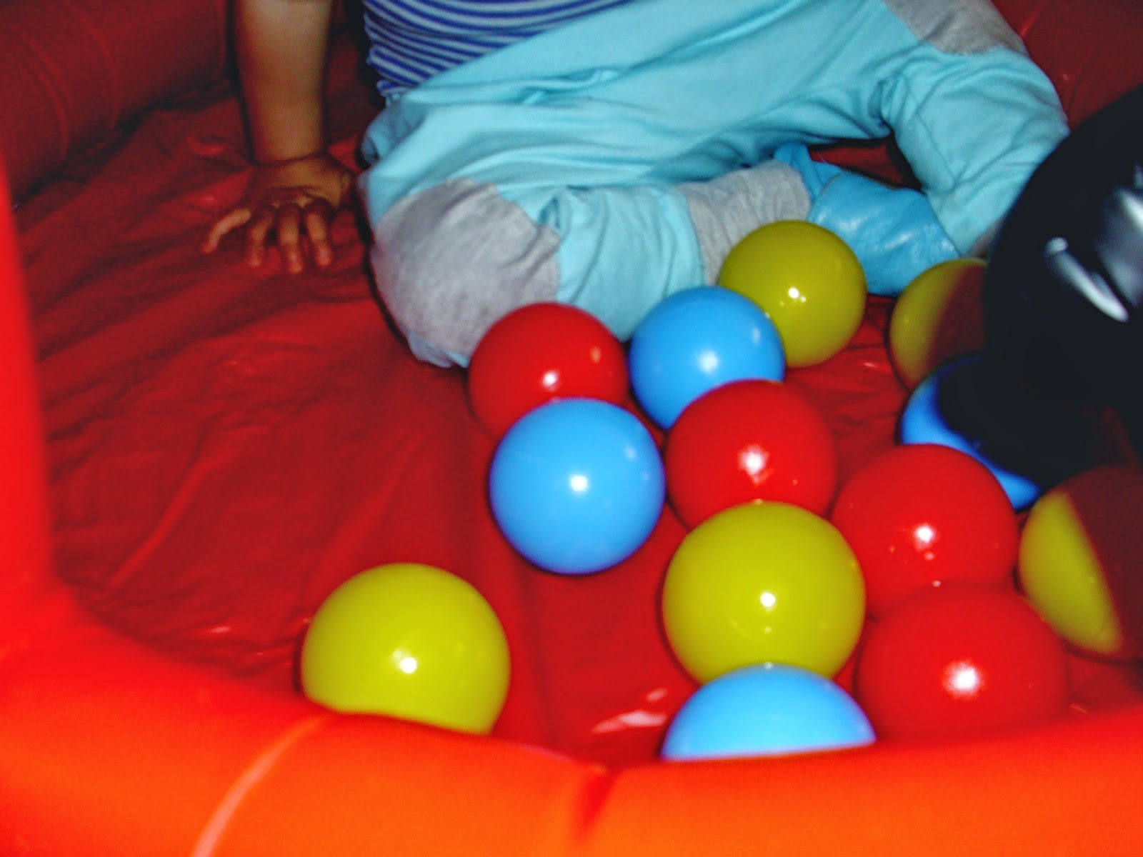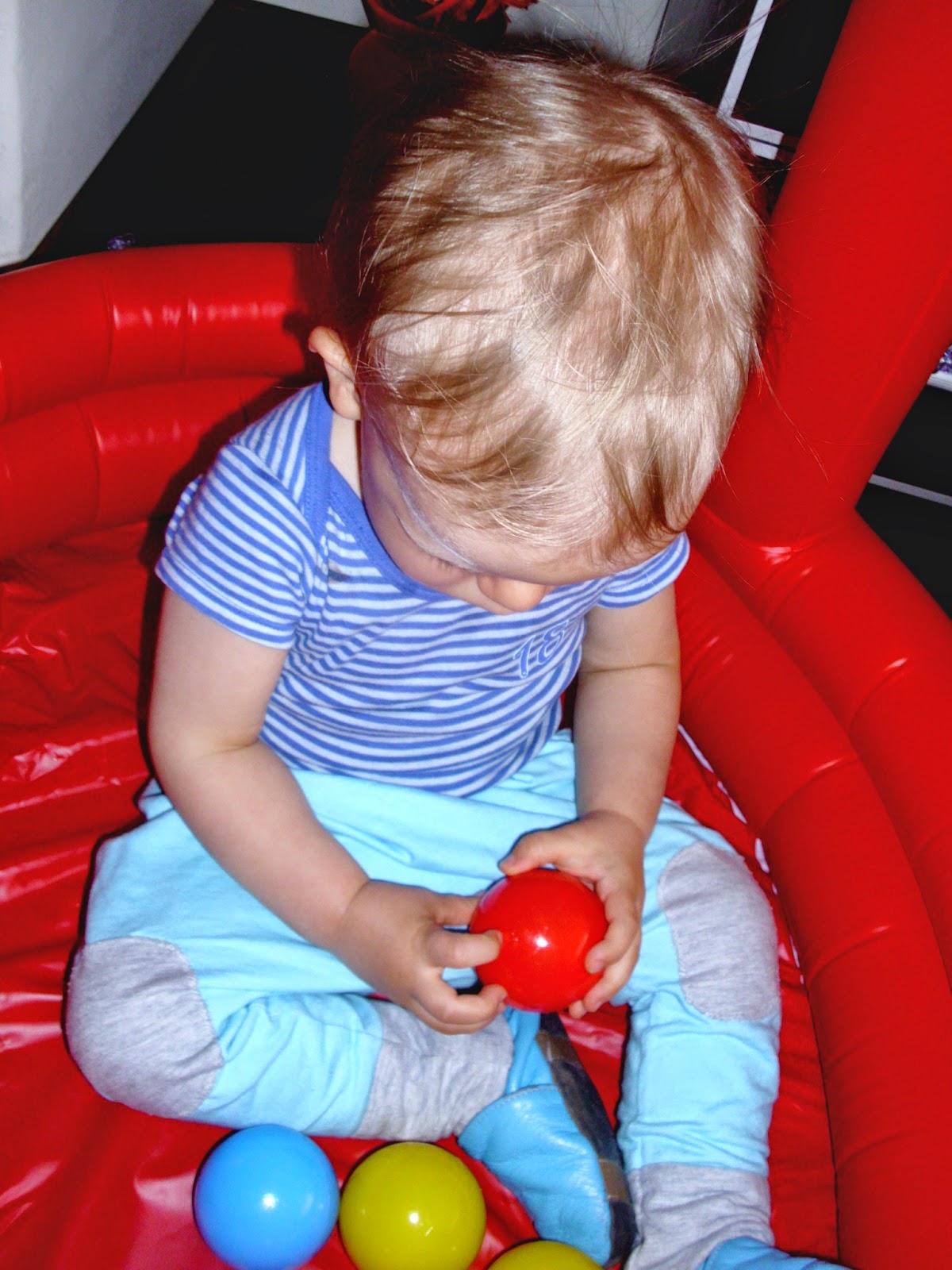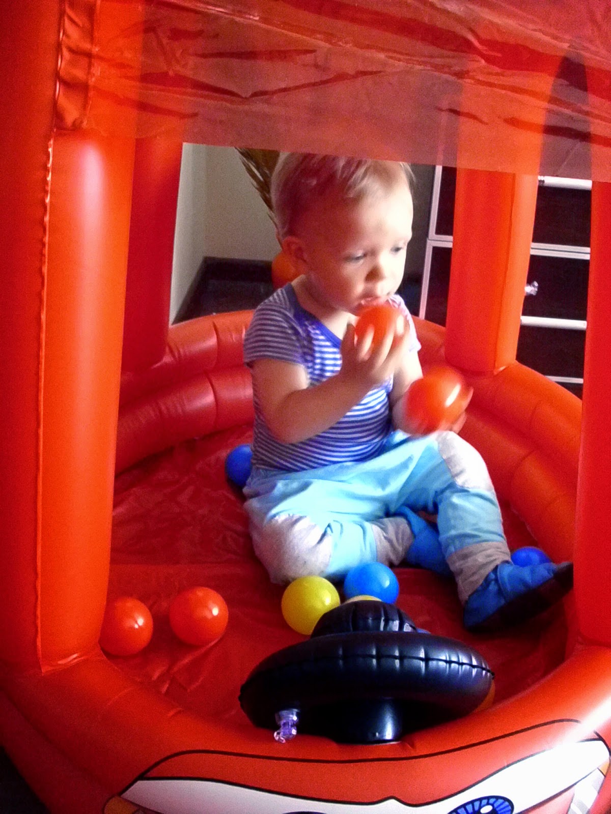 Miejsca nie mamy już wiele, a zabawki Kuby zajmują każdy wolny kąt. Dlatego świetnym rozwiązaniem okazał się dmuchany samochód (klik), którego dodatkowymi atrakcjami są piszczący klakson i plastikowe kulki. Kuba oczywiście oszalał z radości jak go zobaczył i niecierpliwie czekał, aż dziadek go napompuje. Radość była, ogromna. Oczywiście jak na złość baterie w aparacie rozładowane, więc na zdjęciach, które Wam przedstawiam nie widać już tego ogromnego uśmiechu i błyszczących oczu. Ulubionym zajęciem Kuby w aucie okazało się ściąganie dmuchanej kierownicy. Jak na kombinatora przystało- siada okrakiem na jednym z jego boków i próbuje skakać. Taki agent.