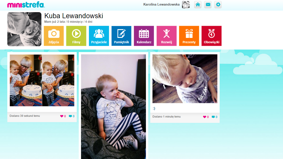 Przede wszystkim jego zdjęcia, które mogą być komentowane i oznaczane serduszkiem przez użytkowników portalu, którym pozwolimy na dostęp do strefy naszego malucha. W pamiętniku możemy również zamieszczać filmy, opisywać szczególne dla rodziny chwile, oraz planować istotne wydarzenia, jak imeniny dziecka, czy wizyta u lekarza. W zakładce „rozwój” zamieścimy informacje dotyczące wagi i wzrostu dziecka. Świetną opcją jest możliwość stworzenia własnej listy prezentów- możemy nie tylko opisać wymarzoną przez dziecko zabawkę, ale i dodać jej zdjęcie, aby ułatwić rodzinie znalezienie danego przedmiotu. Moją ulubioną opcją są „obowiązki”, gdzie możemy oceniać jak dziecko wykonywało dane czynności podczas poszczególnych dni tygodnia.
