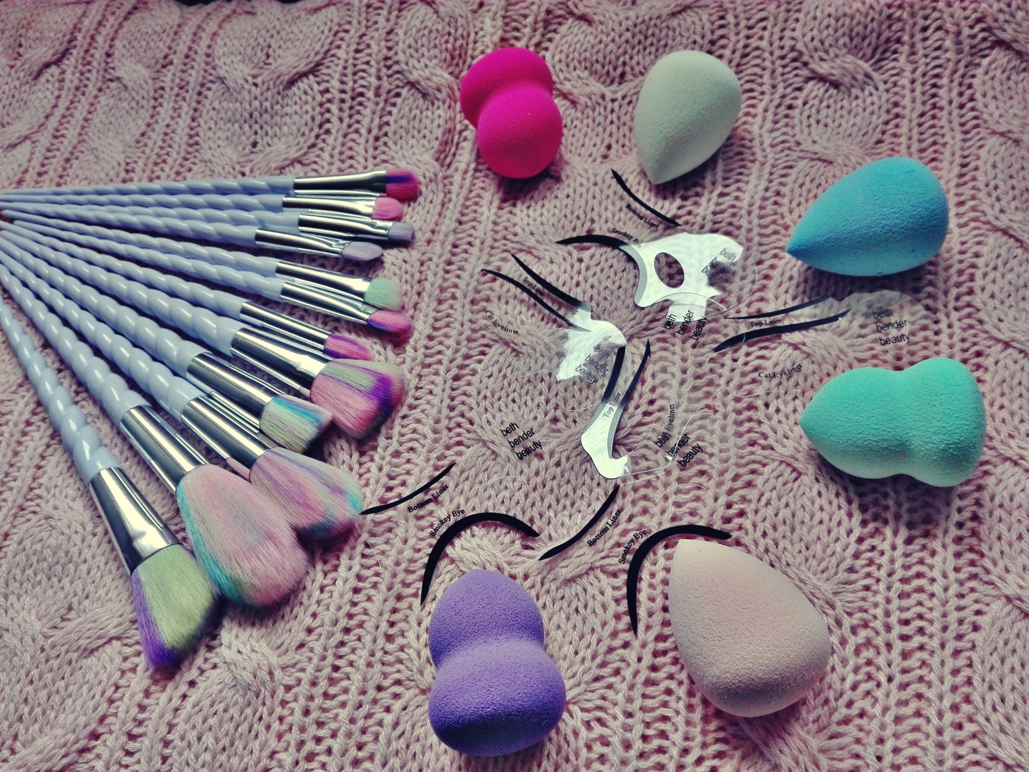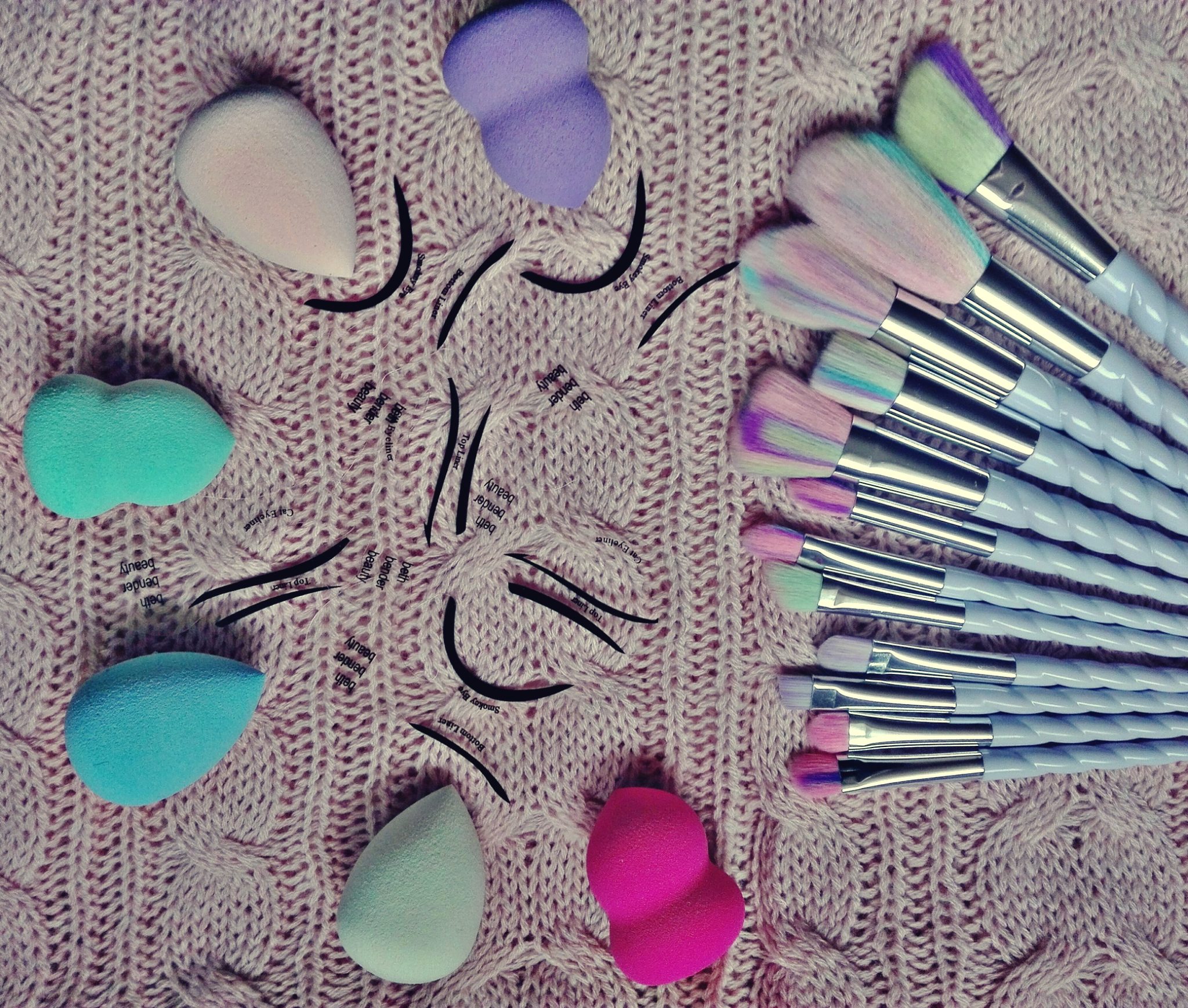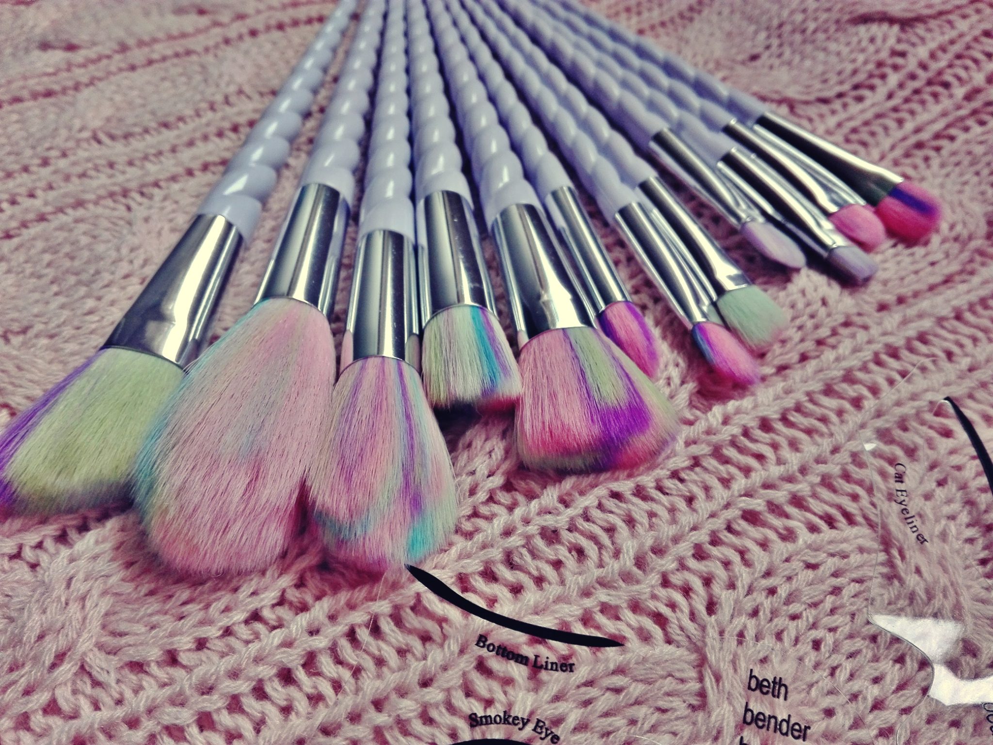 Na pierwszy ogień pójdą pędzle – jak wspominałam już na blogowym fan page, strasznie byłam ich ciekawa. Do tego stopnia, że zmyłam makijaż i nałożyłam go ponownie. Podeszłam do nich nieco z dystansem i tak naprawdę mimo wszystko nie oczekiwałam wiele. Wypróbowałam kilka z nich – trzy do cieni, jeden do pudru, jeden do rozświetlacza i jeden do różu. Resztę postanowiłam zostawić na później – wyglądają tak obłędnie, że najzwyczajniej w świecie żal mi z nich korzystać, serio! Aleeee, do rzeczy – włosie syntetyczne, ale meeeega puchate – co niego utrudnia aplikację cieni. Po prostu przez te wszystkie kolory nie widać dokładnie, ile cienia jest na włosiu. Myślę jednak, że to bardziej kwestia przyzwyczajenia i z czasem uda mi się to obejść. Jedyny minus, to tak naprawdę fakt, że rączki miały być białe, a nie jasniofioletowe.
