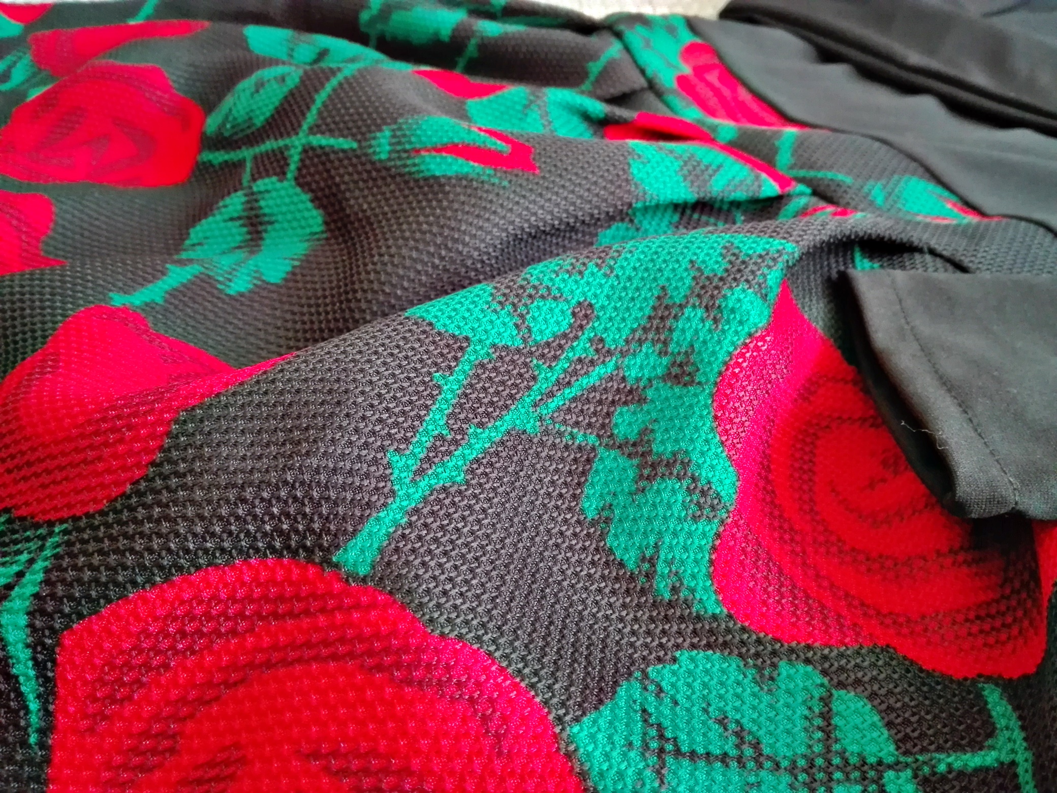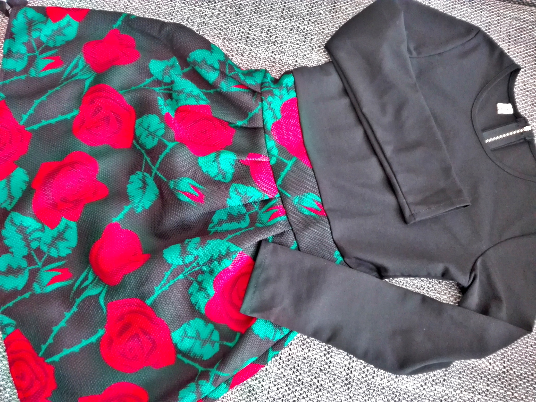 Czarna sukienka z różanym dołem była moim numerem jeden odkąd tylko ją zobaczyłam. Niestety, na zdjęciu bardzo ciężko uchwycić kolor – w rzeczywistości sukienka wygląda jak na katalogowych zdjęciach. Od pasa w górę jest dopasowana, zaś różany dół pięknie rozkłada się dookoła bioder.