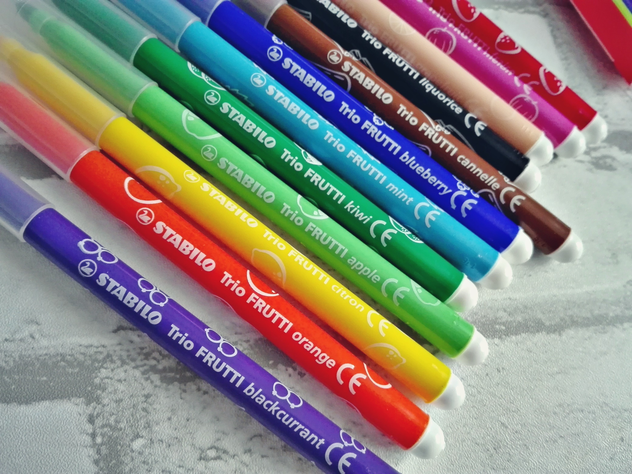 Tutaj się na momencik zatrzymamy, ponieważ są najlepsze flamastry jakie miałam. Dwanaście sztuk, każdy w innym kolorze i… każdy z nich pachnie zupełnie inaczej. Mało tego, ten zapach czuć nawet na papierze, w efekcie czego rysowanie nimi to naprawdę czysta przyjemność. Zapachy są po prostu obłędne, a najbardziej do gustu przypadły mi: jabłko, melon i cynamon.
