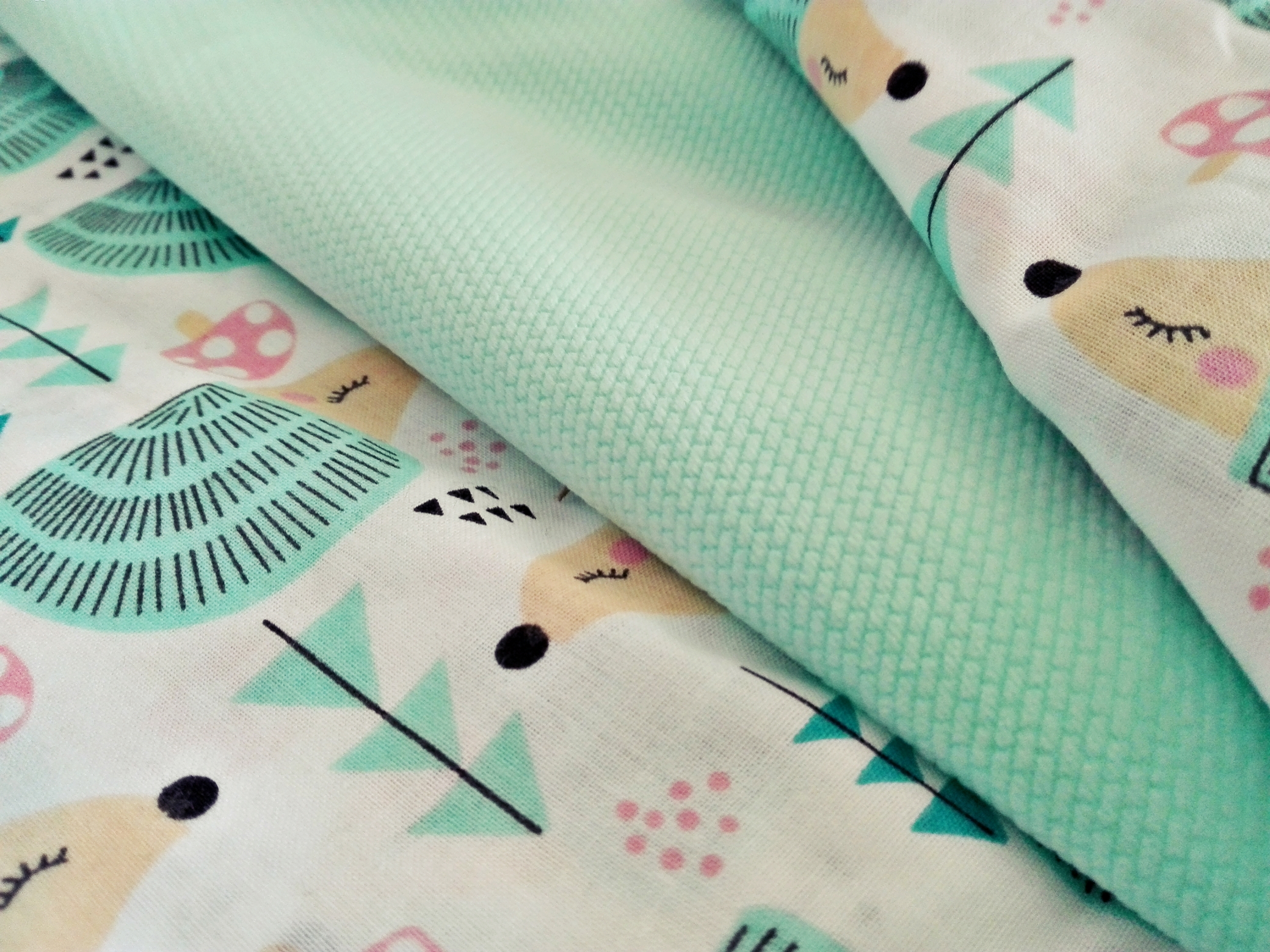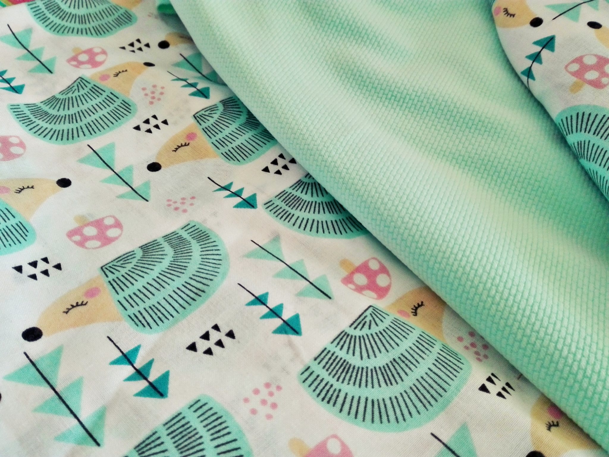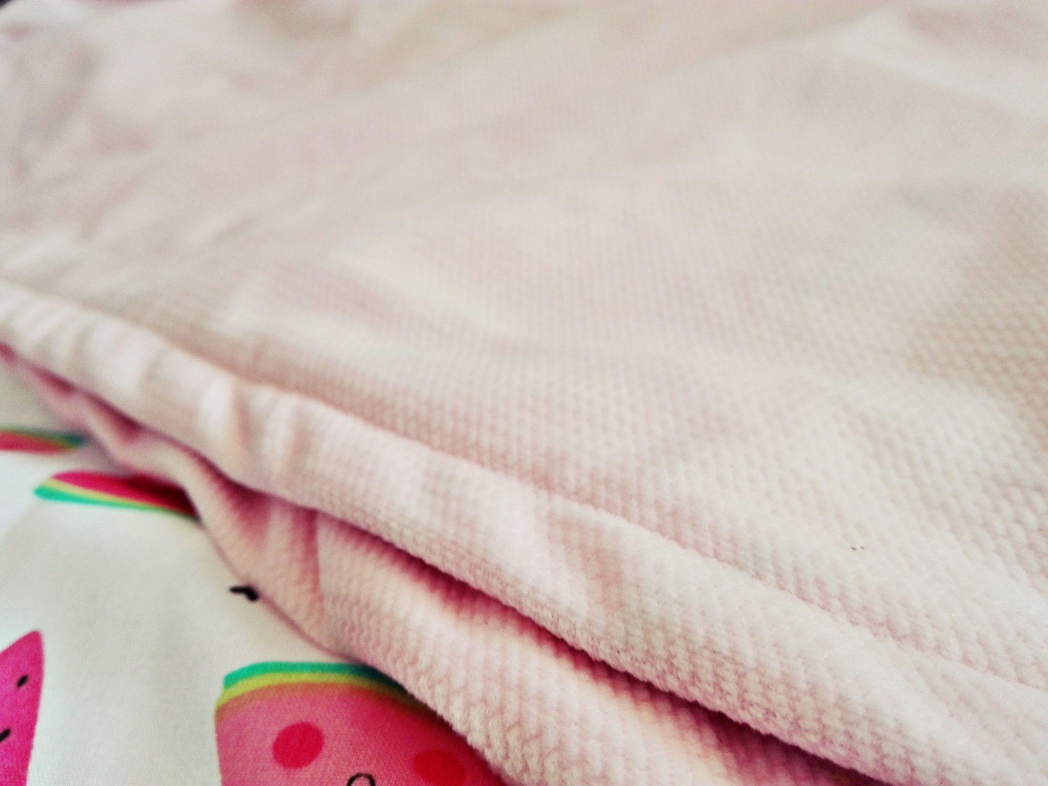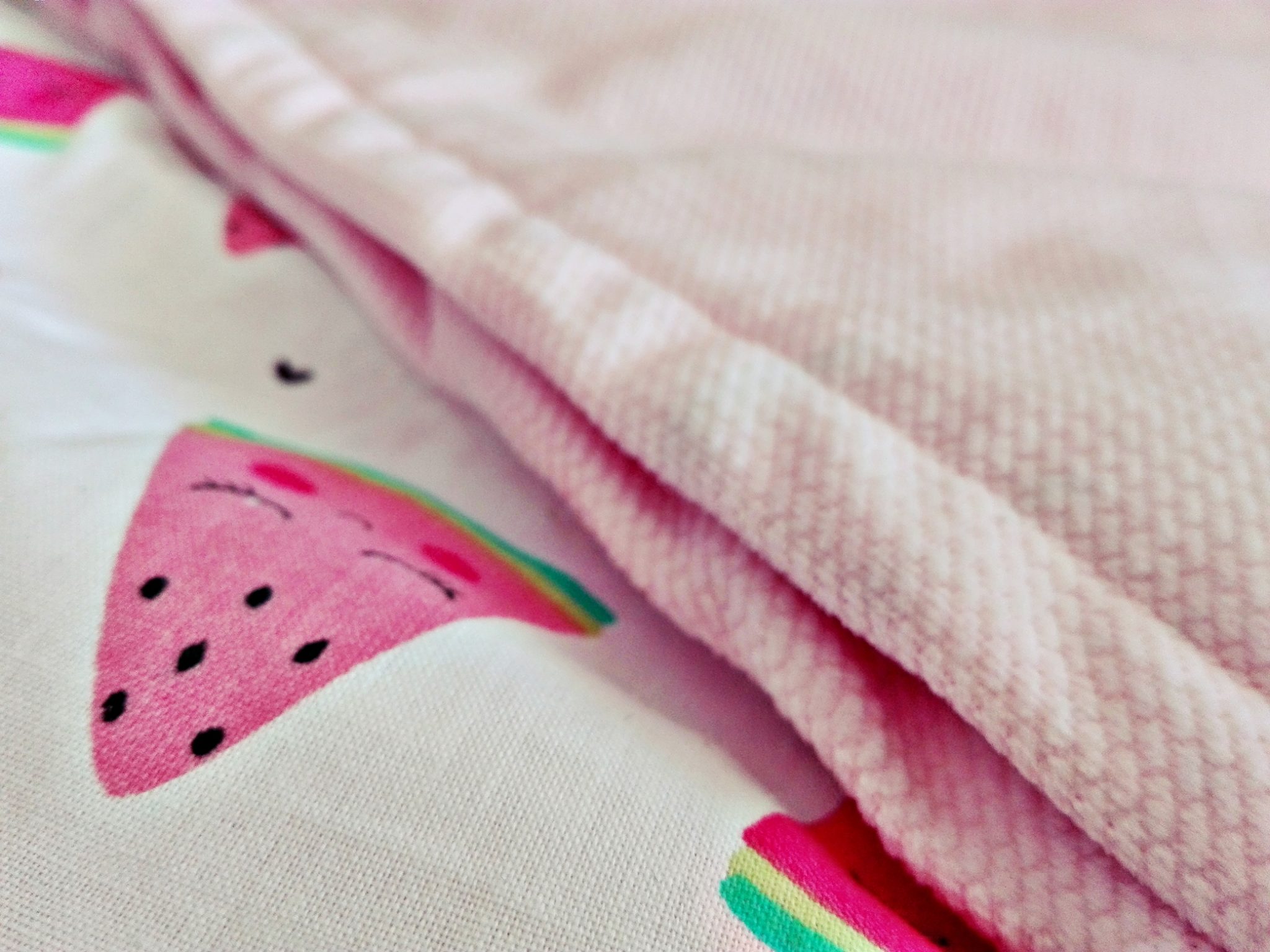 Miałam przyjemność pracować na nowej tkaninie i mimo tego, że z różnych powodów była to prawdziwa przygoda – finalnie z pod mojej ręki wyszły trzy przemiłe kocyki. Pierwszy z nich to połączenie miętowego Velvetu i uroczej tkaniny w jeże, zaś dwa pozostałe powstały w wyniku połączenia jasnoróżowego Velvetu i słodkich arbuzów.