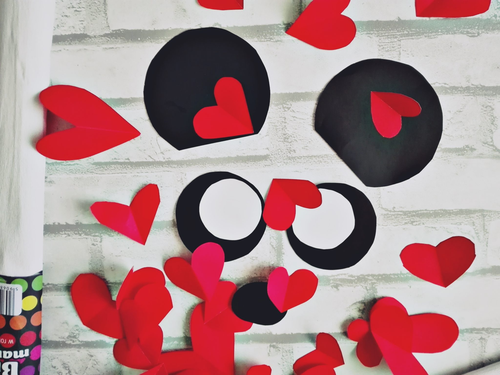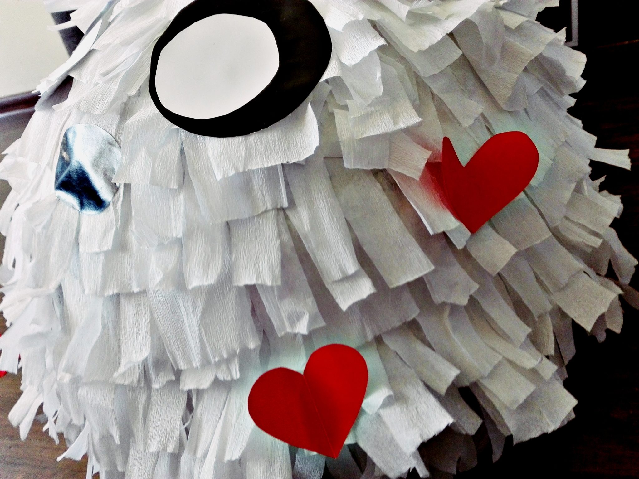 Z wycinanek wycinamy sobie oczka, nosek, uszy. Ja dodatkowo wycięłam też małe serduszka – to była akurat zachcianka Kuby, ale to w końcu piniata dla niego, więc nie widziałam żadnego problemu.