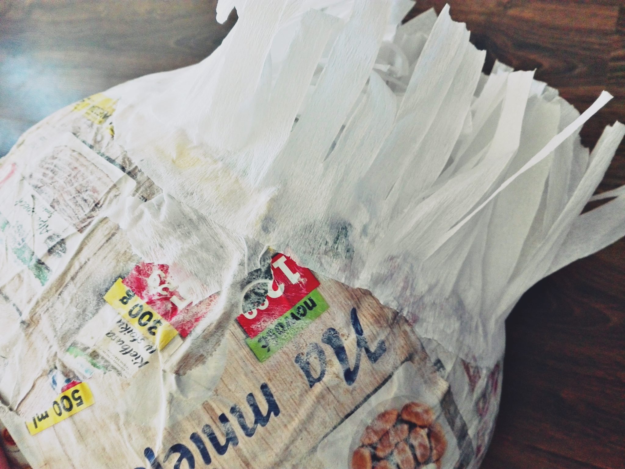 Przygotowanie kuli pod piniatę jest bardzo proste. Wystarczy nam większy balon, trochę gazety, klej stworzony z mąki i wody. Co istotne – warto przygotować sobie tę kulkę parę dni wcześniej, bo niestety schnie prawie 48 godzin. U nas było zaledwie kilka warstw gazety i kleju (nie chciałam, aby kula była szczególnie twarda, bo Kuba mógłby nie dać sobie z nią rady), a sam proces schnięcia zajął około czterdziestu godzin. W czasie, w którym kula się suszyła – ja przygotowałam sobie na spokojnie całą resztę rzeczy, która była mi później potrzebna.