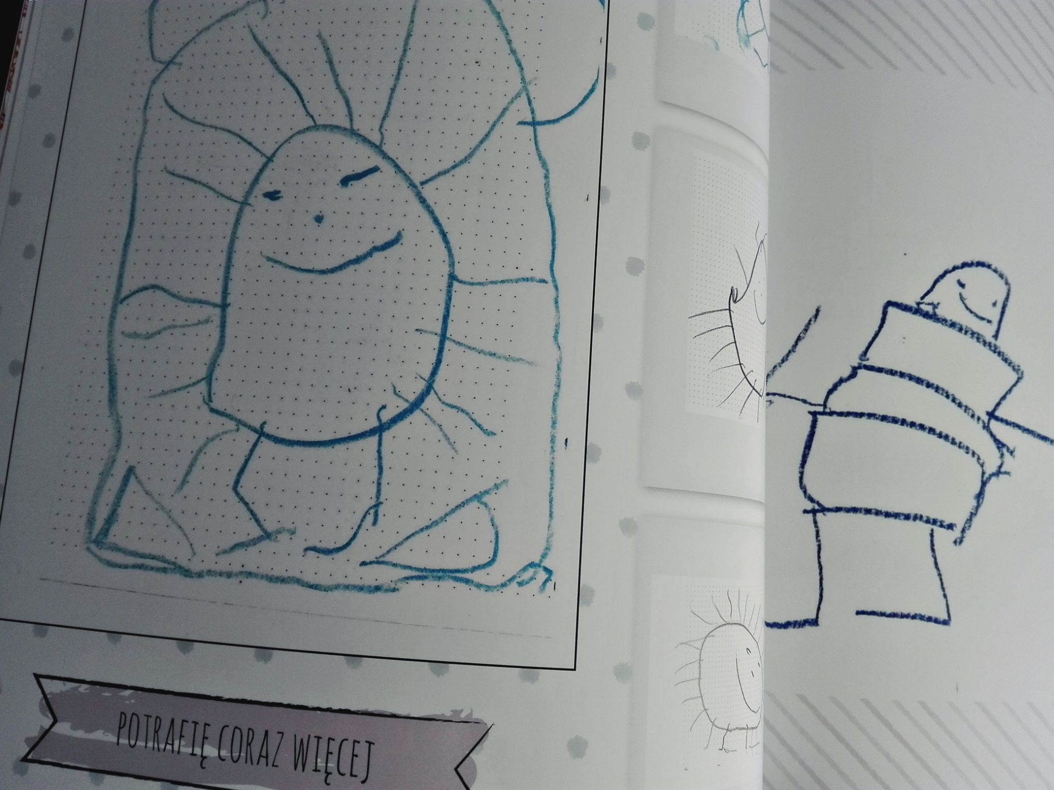 Jak widzicie znów zdecydowałam się na największy format fotoksiążki – 30×30 cm. Początkowo skłaniałam się ku mniejszej wersji, jednak ostatecznie spytałam o to Kubę, a on zażyczył sobie dużej książki. Kiedy skanowałam jego rysunki starałam się, aby nie podpatrywał i tym sposobem dopiero w momencie, w którym wziął fotoksiążkę do rąk zobaczył co się w niej znajduje. Efekt? Jak to u Kuby: „O jej, jakie słodkie!„, a potem… cała lawina pytań typu: „Ile miałem lat, jak to narysowałem?„, „A co to ma być, takie śmieszne? Chyba jakieś gryzdoły, haha!„. Śmiechom i uśmiechom podczas oglądania fotoksiążki nie było końca.