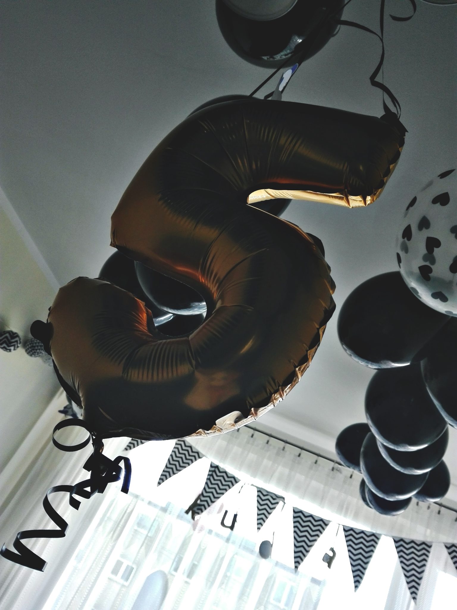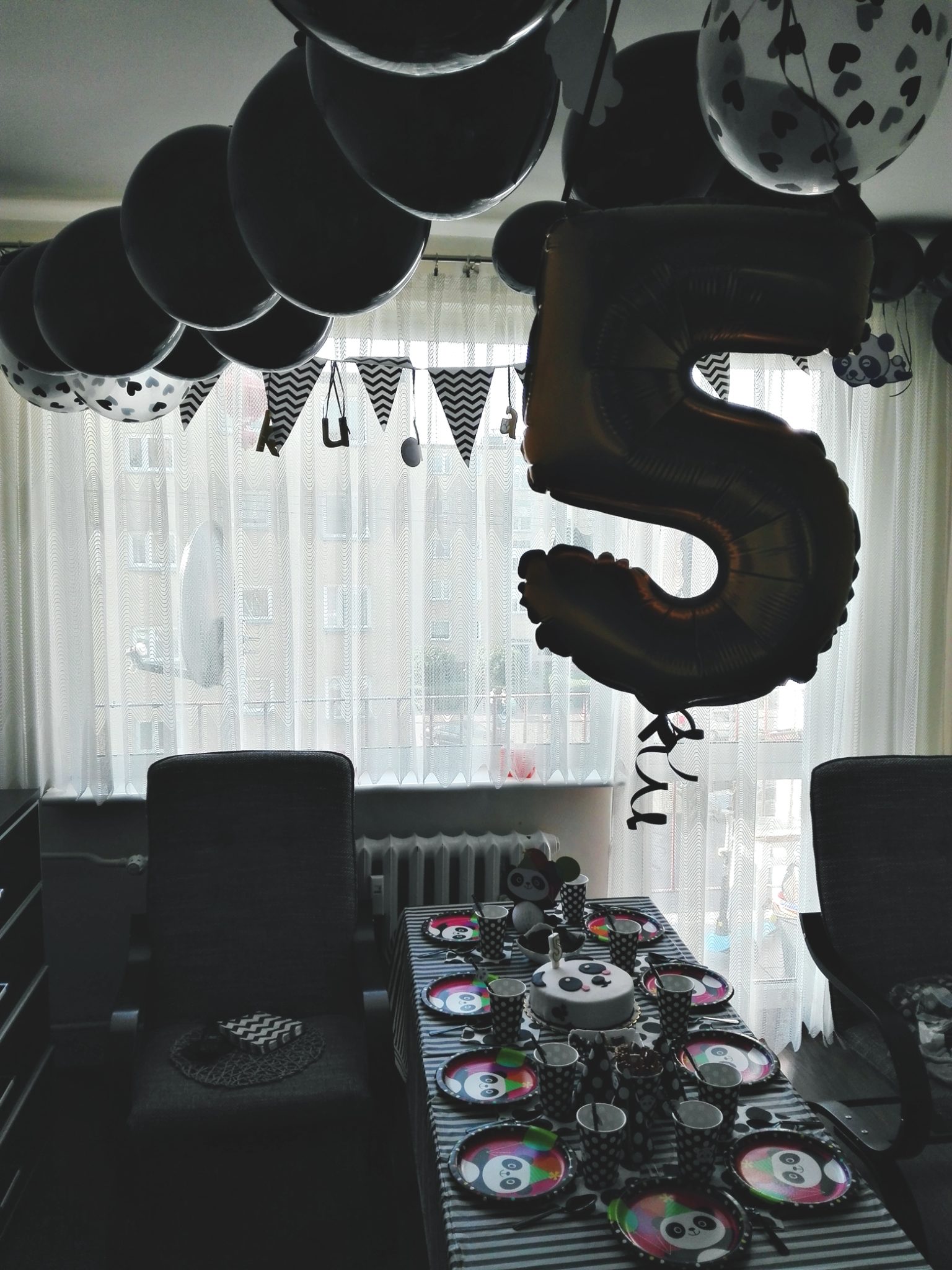 Muszę przyznać, że przygotowanie urodzin z motywem pandy było dużo łatwiejsze, niżeli chociażby zeszłoroczne zielone świnie z Angry Birds. Tutaj od razu wiadomym było, że potrzebne są dekoracje skąpane bielą i czernią, więc z ich wyborem nie mieliśmy żadnego problemu. Co istotne – Kuba miał spory wpływ na to, jakie dekoracje się pojawią, jak będą ułożone czy gdzie będą wisiały balony. Sam dumnie biegał z pompką i pomagał mi na tyle, na ile starczyło mu sił.