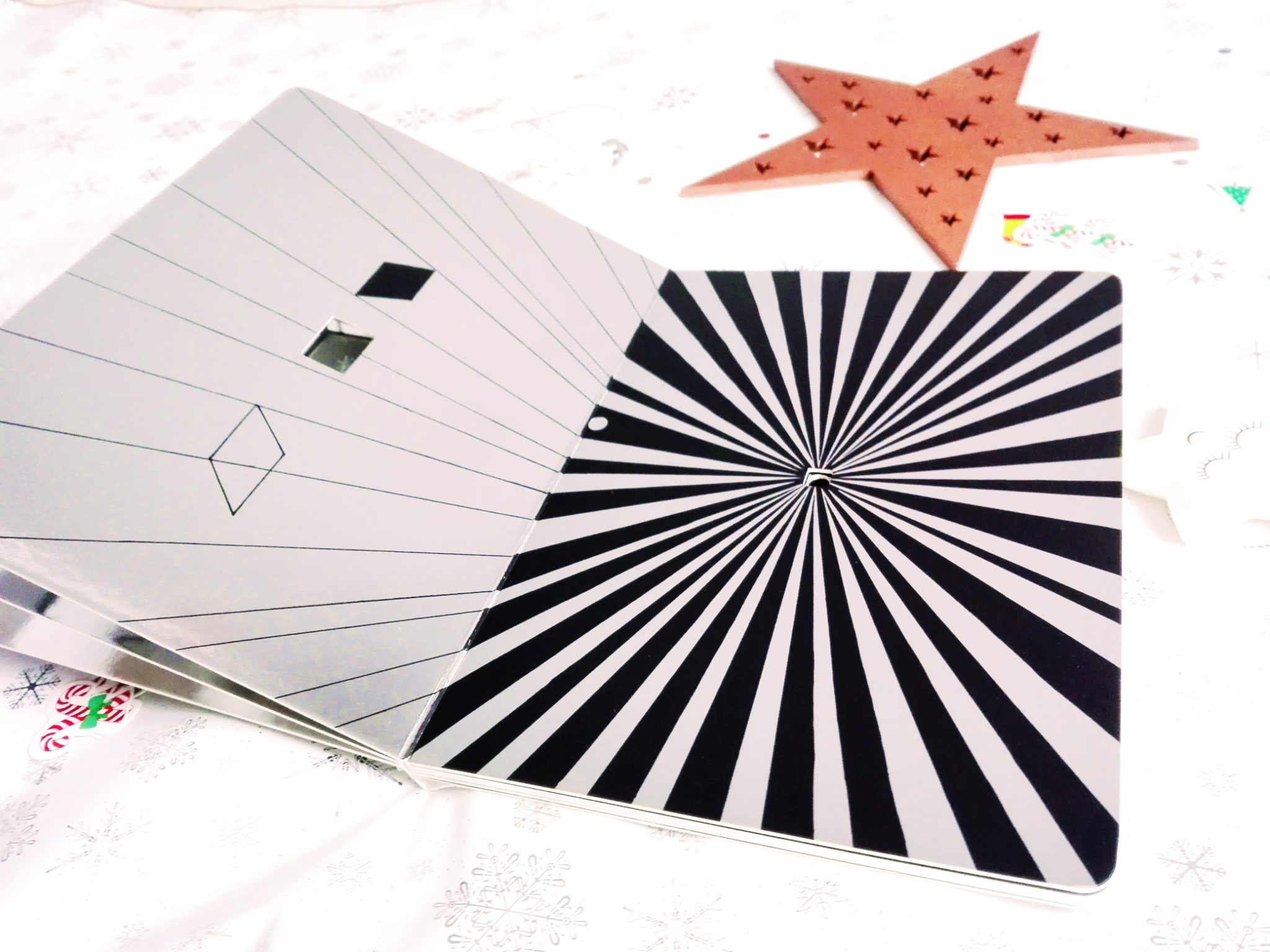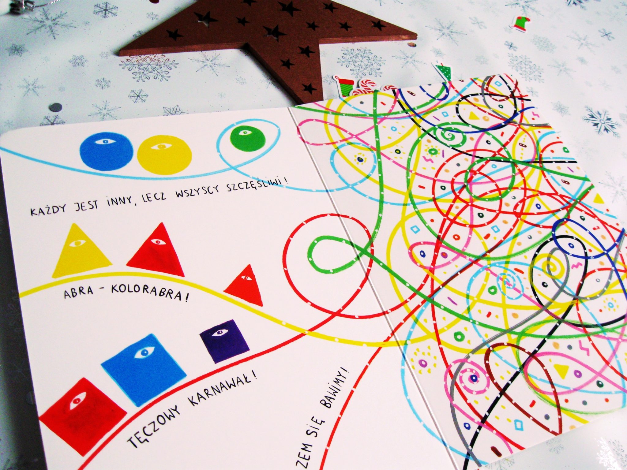 Przyznam, że ta książka jest najbardziej szaloną pozycją pod względem kolorów, jaką kiedykolwiek moje oczy widziały. Napisałam widziały, bo przy moich problemach z błędnikiem i nadwrażliwości na takie połączenia kolorów – zwariowałam, serio! Jednak dla osób, które problemów z oczami nie mają i dla dzieci – pozycja z całą pewnością będzie bardzo interesująca. Na każdej ze stron narysowane są różnego rodzaju linie i zawijasy, przy czym książkę da się rozłożyć tak, że na górze i na dole mamy zupełnie inny system linii.