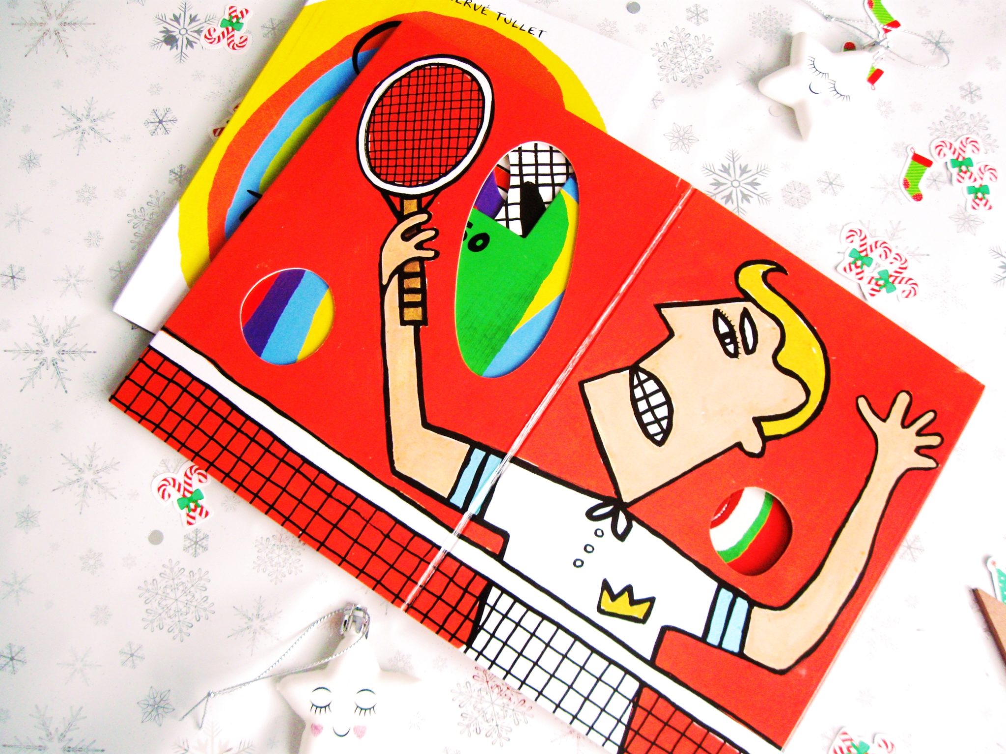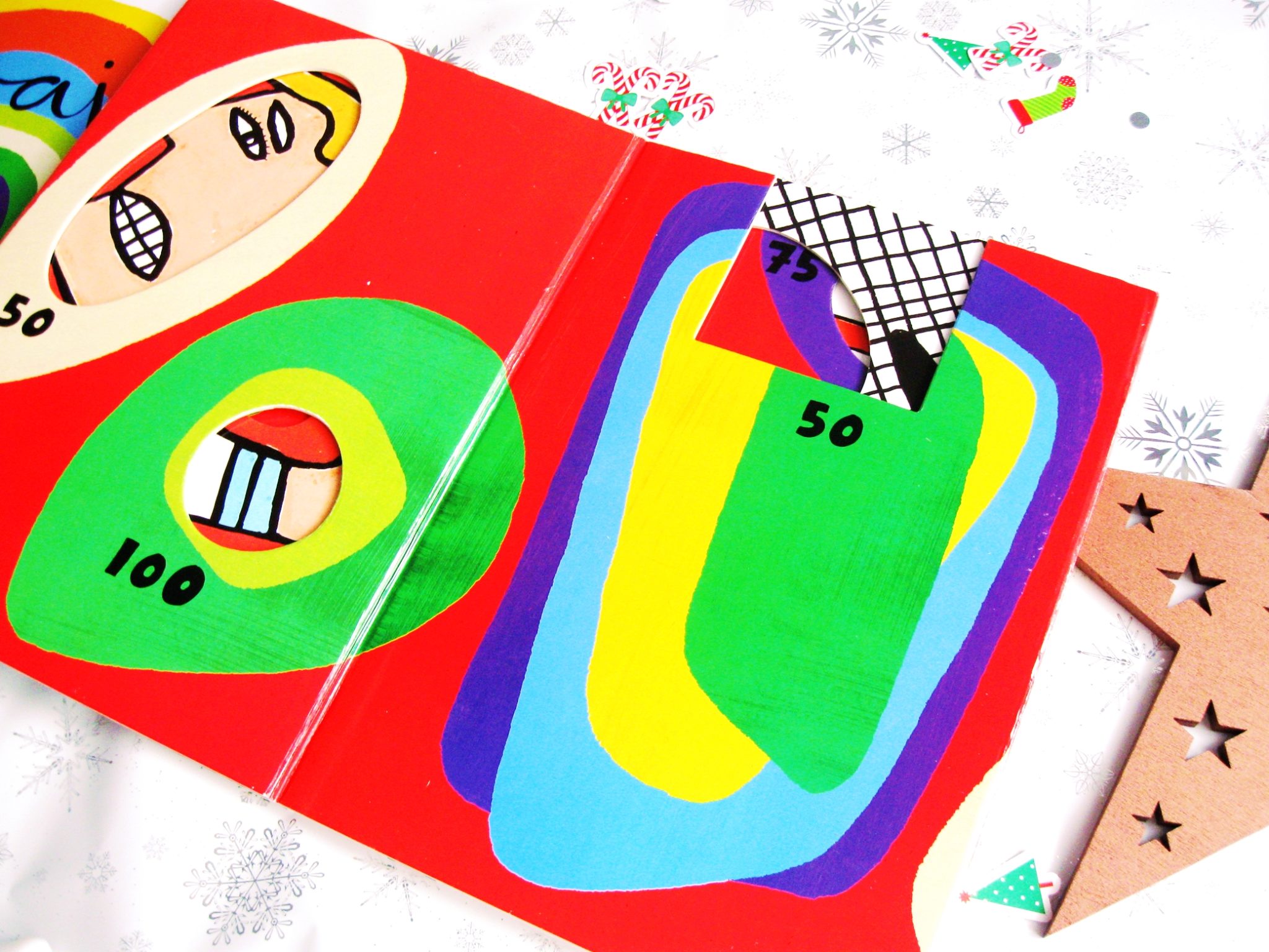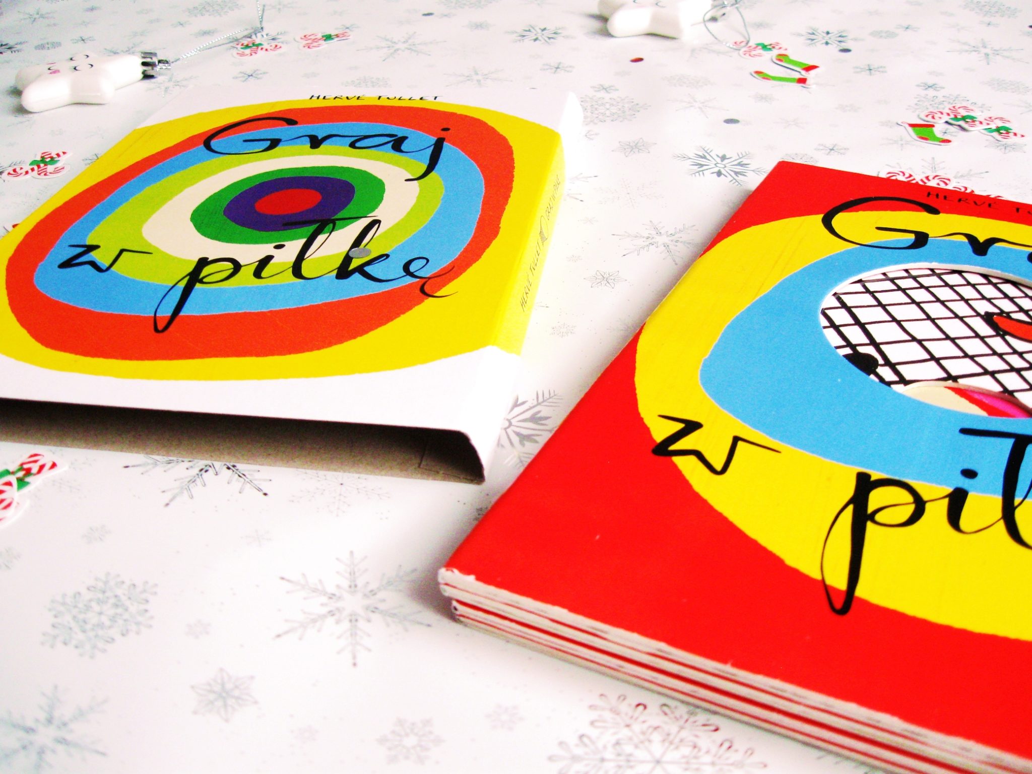 Wydaje mi się, że to najbardziej aktywizująca z dotychczas przetłumaczonych na język polski książek Hervé Tulleta. Z boku książki mamy do wygięcia „piłkę„, którą następnie próbujemy rzucić do wybranych dziurek i zdobywać punkty. Dotychczas myślałam, że malucha najbardziej angażują „Naciśnij mnie!„, „Kolory” czy „Figle Migle„, ale teraz sądzę, że tutaj autor wymaga od dziecka czegoś znacznie więcej i bardzo mi się to podoba.