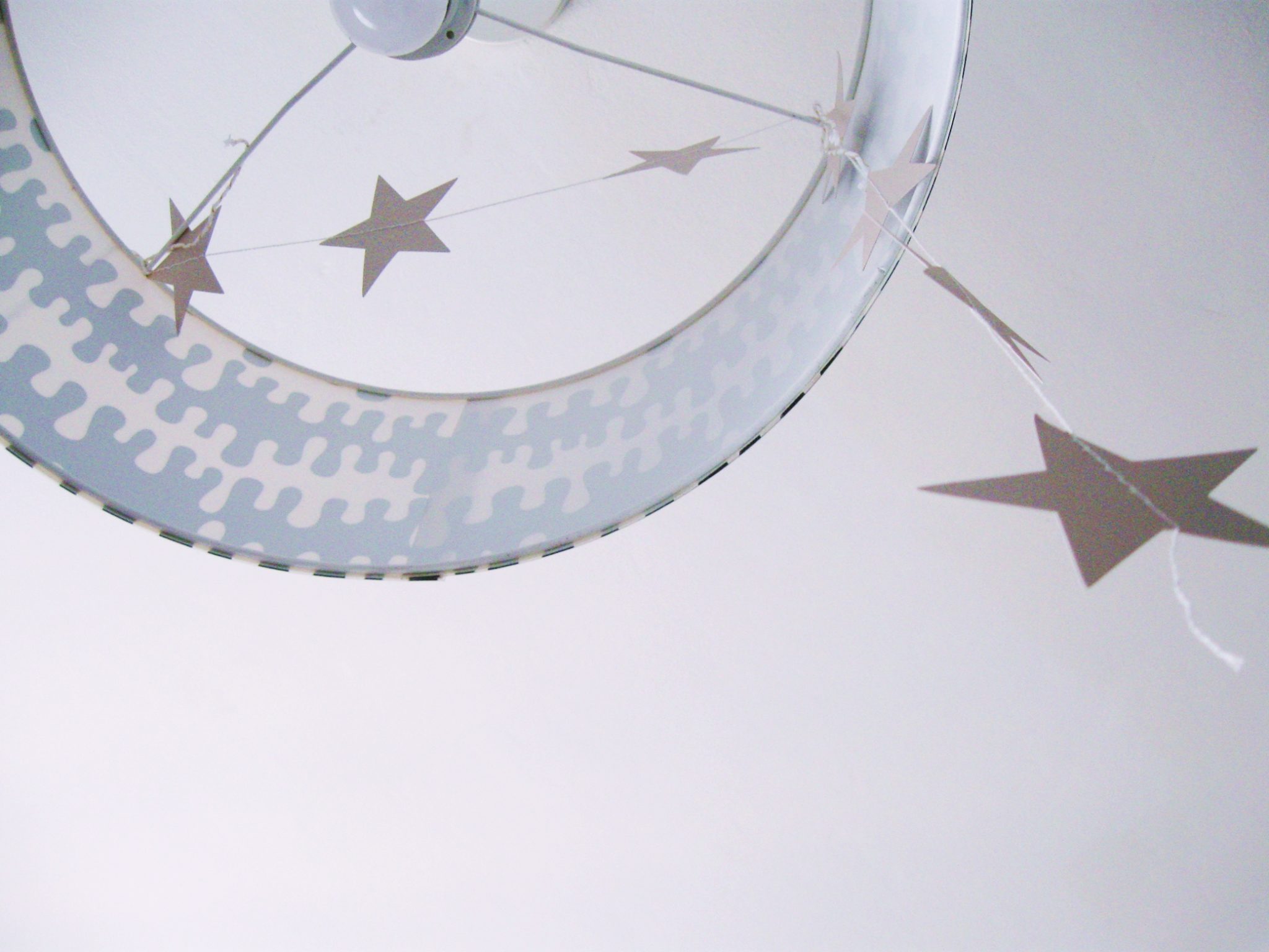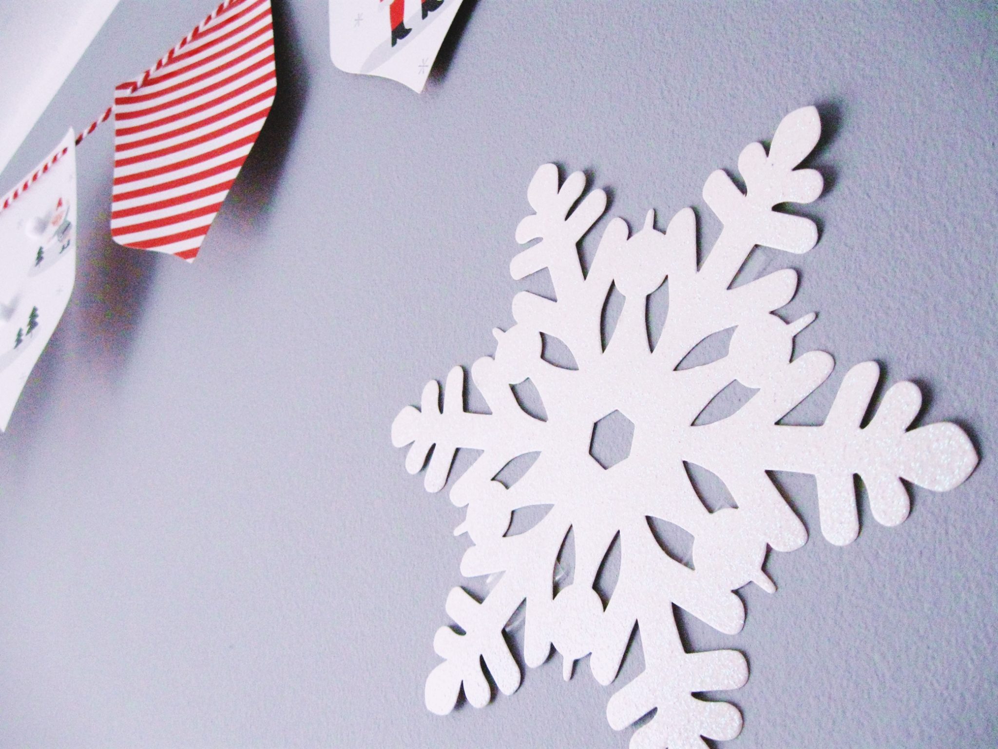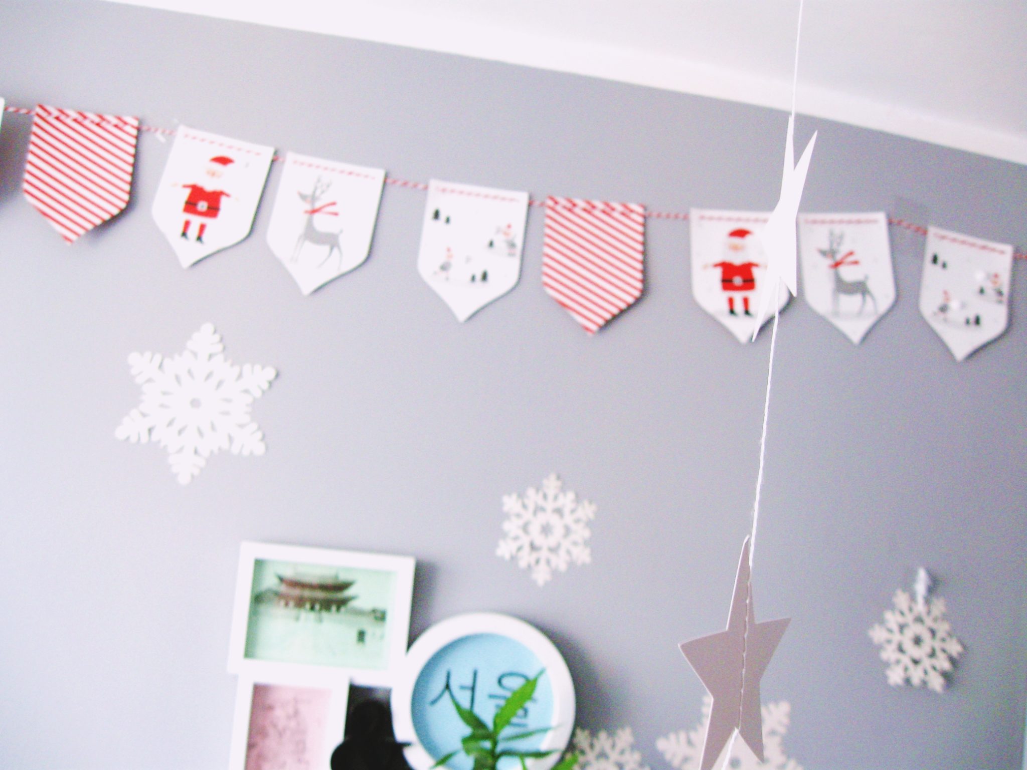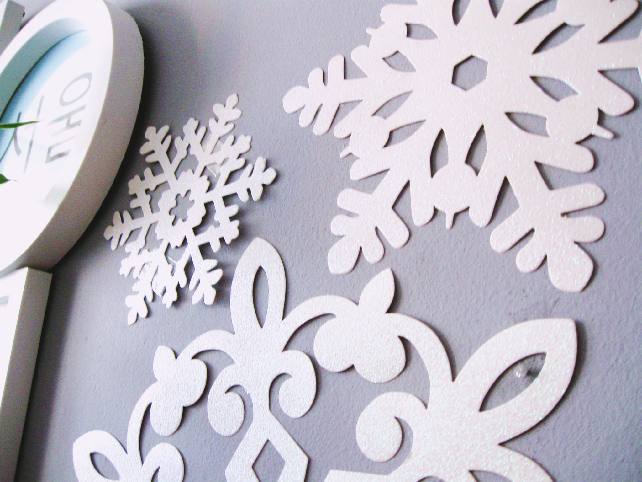 Na ścianie pojawiły się girlandy „Czekając na Mikołaja” i srebrne gwiazdki, a także urocze płatki śniegu, które są różnej wielkości. Chcąc uniknąć tandetnego efektu zdecydowałam się na dekorację tylko jednej ze ścian pokoju – tej, która jest najbardziej widoczna, kiedy leżymy w łóżku. Koniec końców planuję odczepić srebrne gwiazdki z sufitu i zamocować je wokół ramy łóżka, równolegle z białymi lampkami – efektem z pewnością się z Wami podzielę.