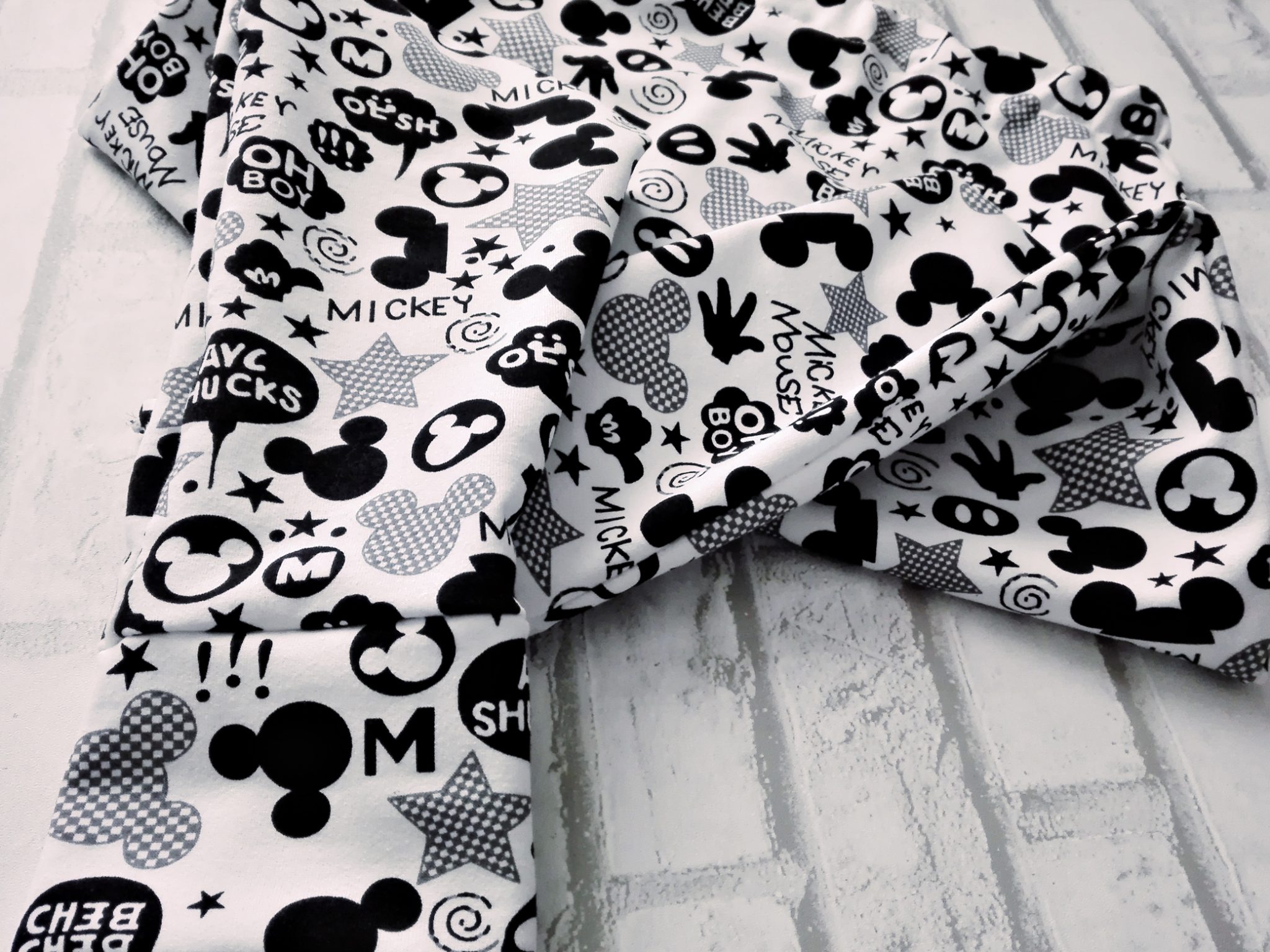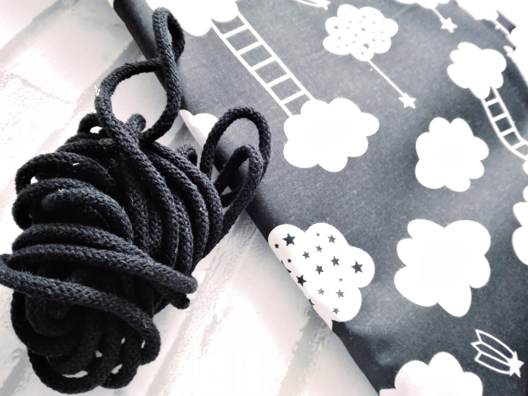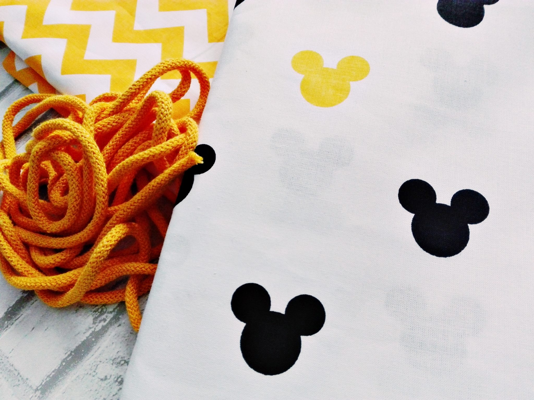 Dla siebie wybrałam połączenie bieli i żółci, z delikatnym dodatkiem koloru czarnego. Tkanina z Myszką Miki od razu skradła moje serce i nawet nie szukałam niczego zastępczego. Połączyłam ją z żółtym chevronem i sznurkiem. Kuba z kolei zdecydował się na połączenie czerni i bieli. Nie ukrywam, że jego wybór nieco mnie zaskoczył, jednak nie stawiałam żadnych oporów. Dodałam do tego czarną tkaninę bawełnianą i sznurek.