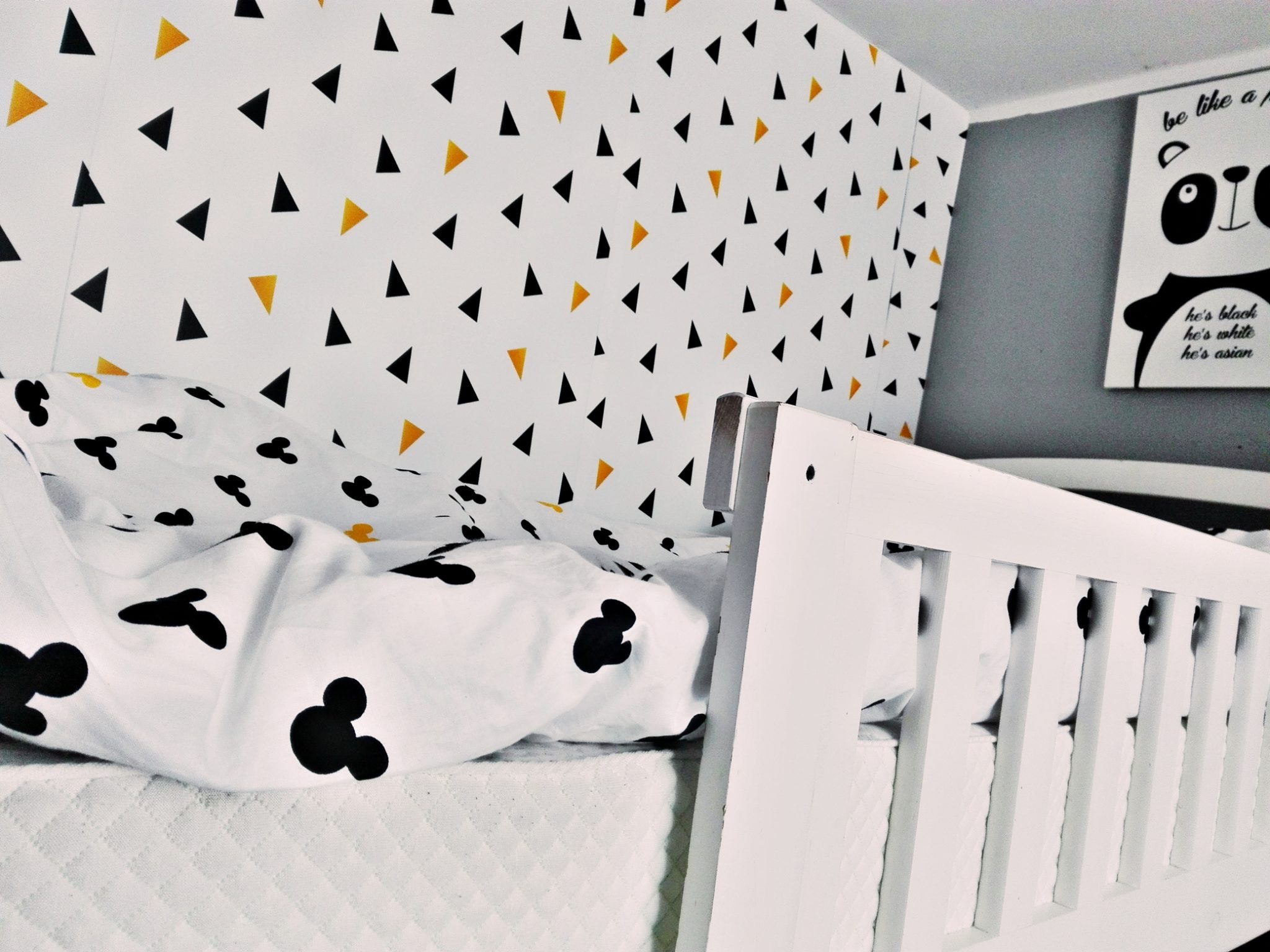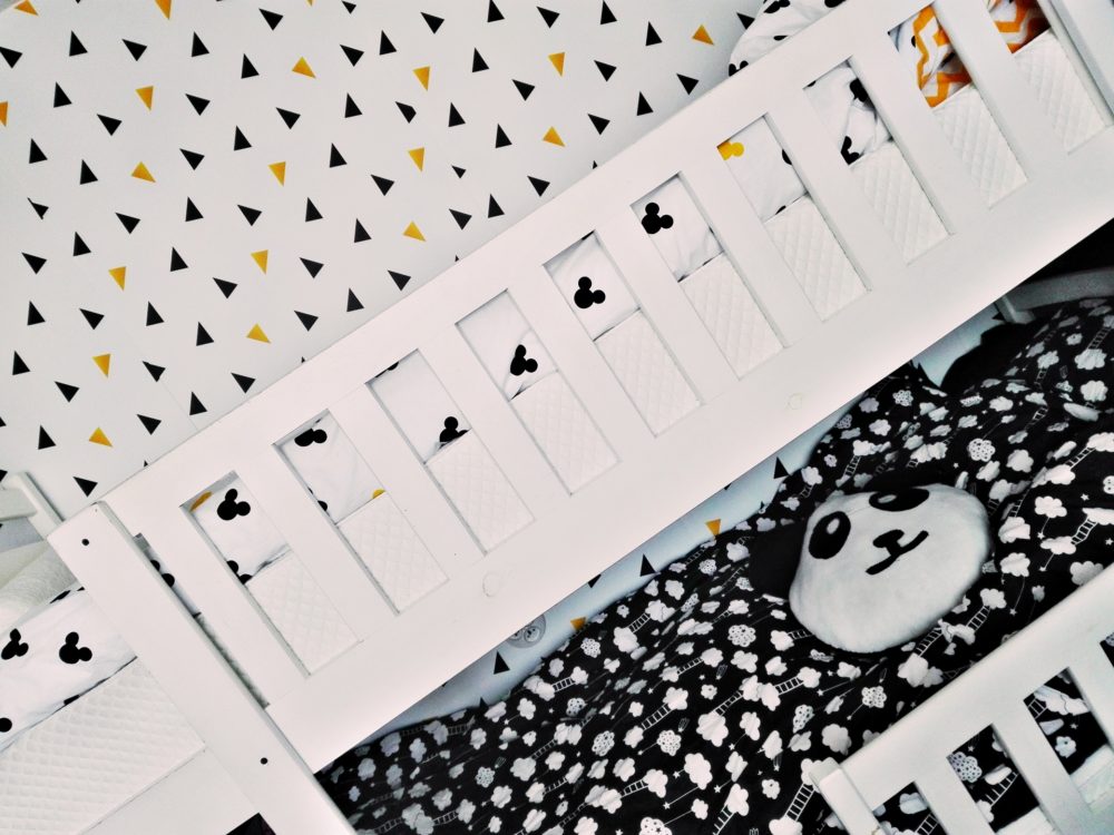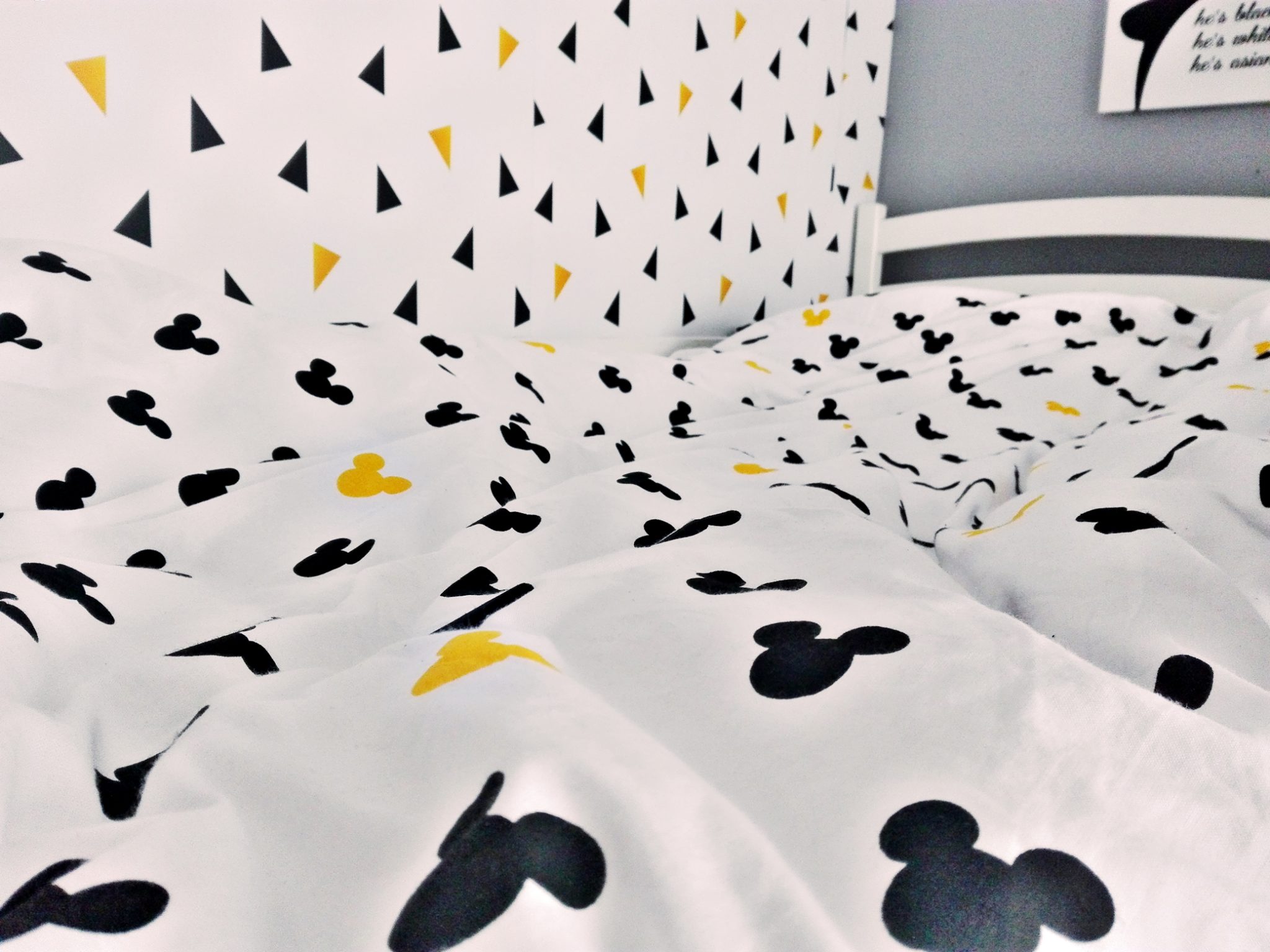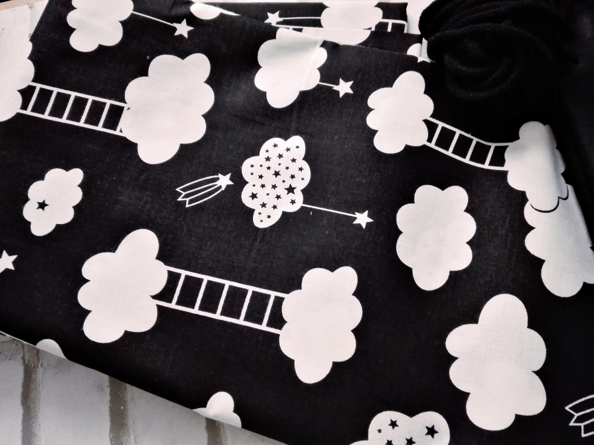 Dla siebie wybrałam połączenie bieli i żółci, z delikatnym dodatkiem koloru czarnego. Tkanina z Myszką Miki od razu skradła moje serce i nawet nie szukałam niczego zastępczego. Połączyłam ją z żółtym chevronem i sznurkiem. Kuba z kolei zdecydował się na połączenie czerni i bieli. Nie ukrywam, że jego wybór nieco mnie zaskoczył, jednak nie stawiałam żadnych oporów. Dodałam do tego czarną tkaninę bawełnianą i sznurek.