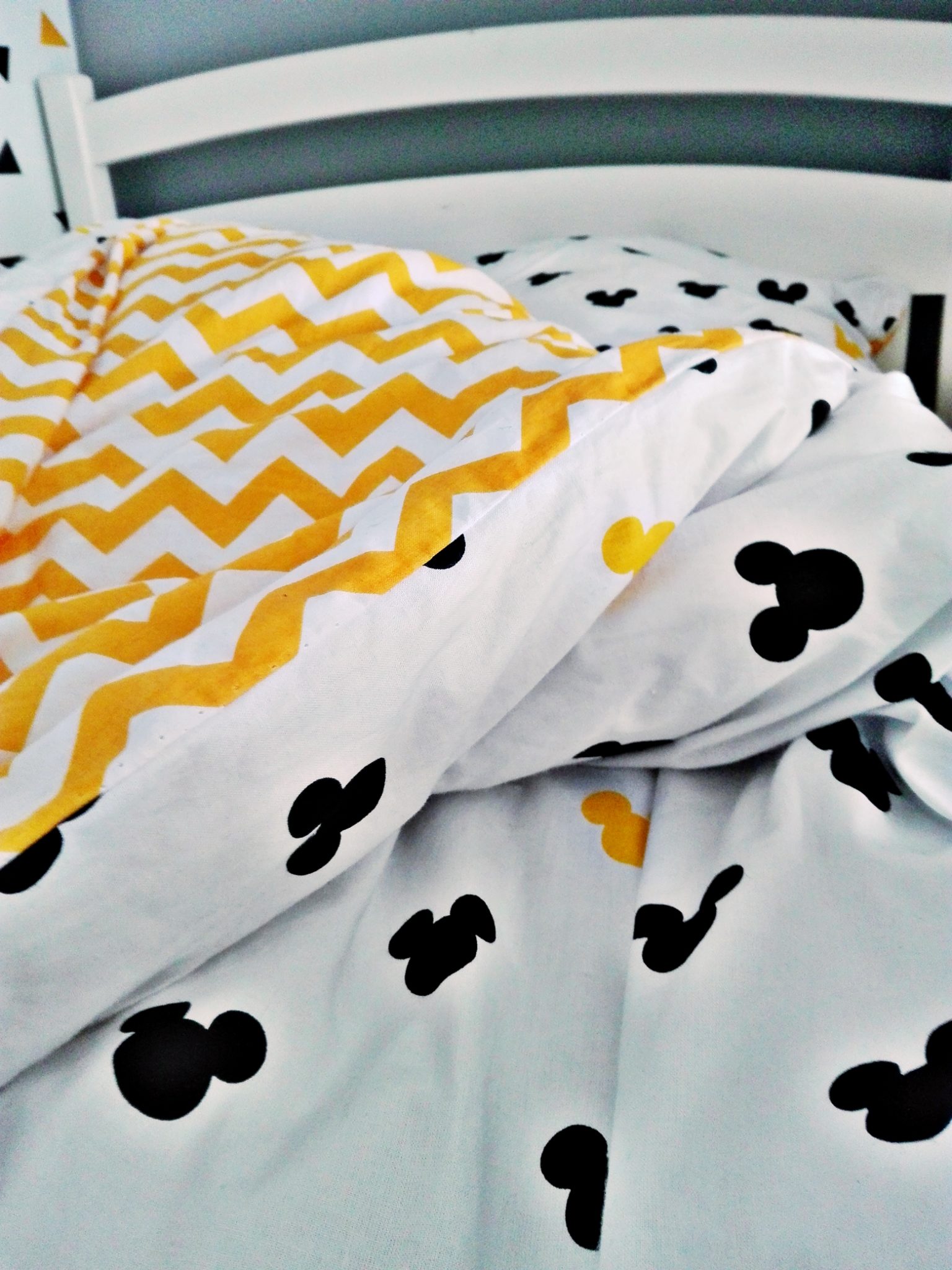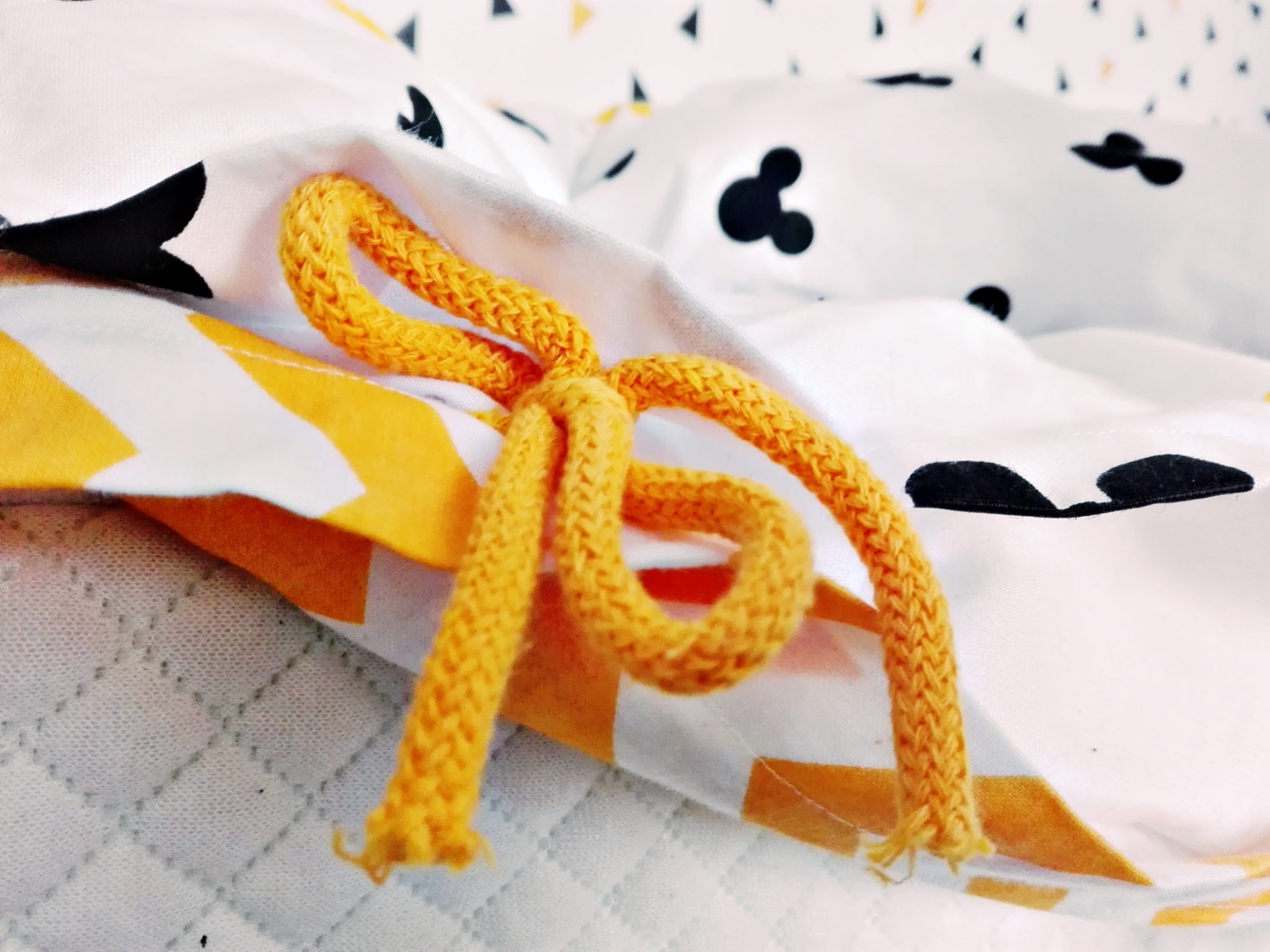 Z pościelą poszło mi zdecydowanie sprawniej – doskonale wiedziałam, czego oczekuję i jak powinnam to zrobić. Tym razem zdecydowałam się na pościel dwustronną, wiązaną na sznureczki. Nigdy nie szyłam pościeli zapinanej na zamek czy guziki – jakoś tak utarło mi się, że są takie zwykłe i „sklepowe”, więc zawsze omijałam te rozwiązanie szerokim łukiem.
