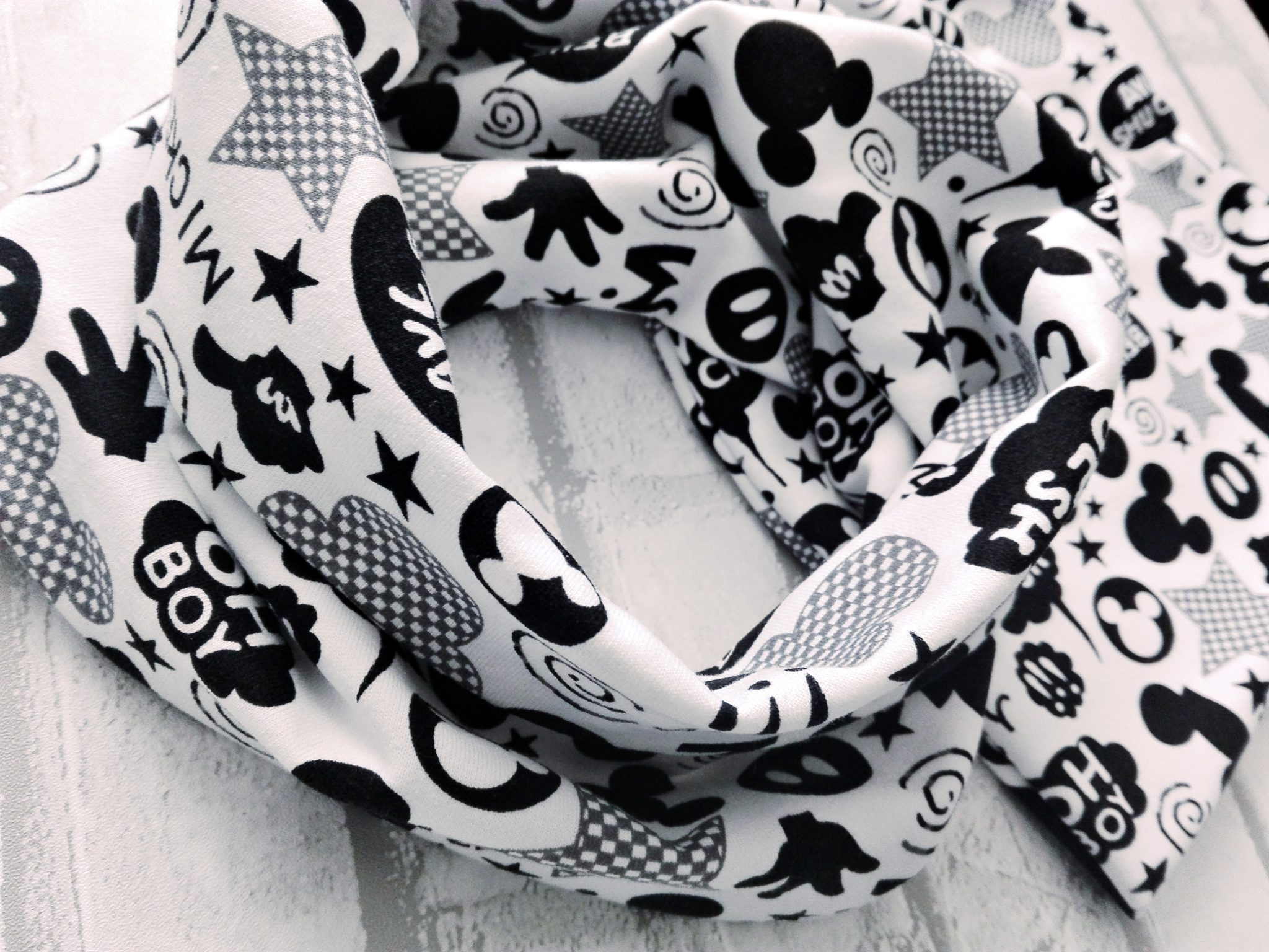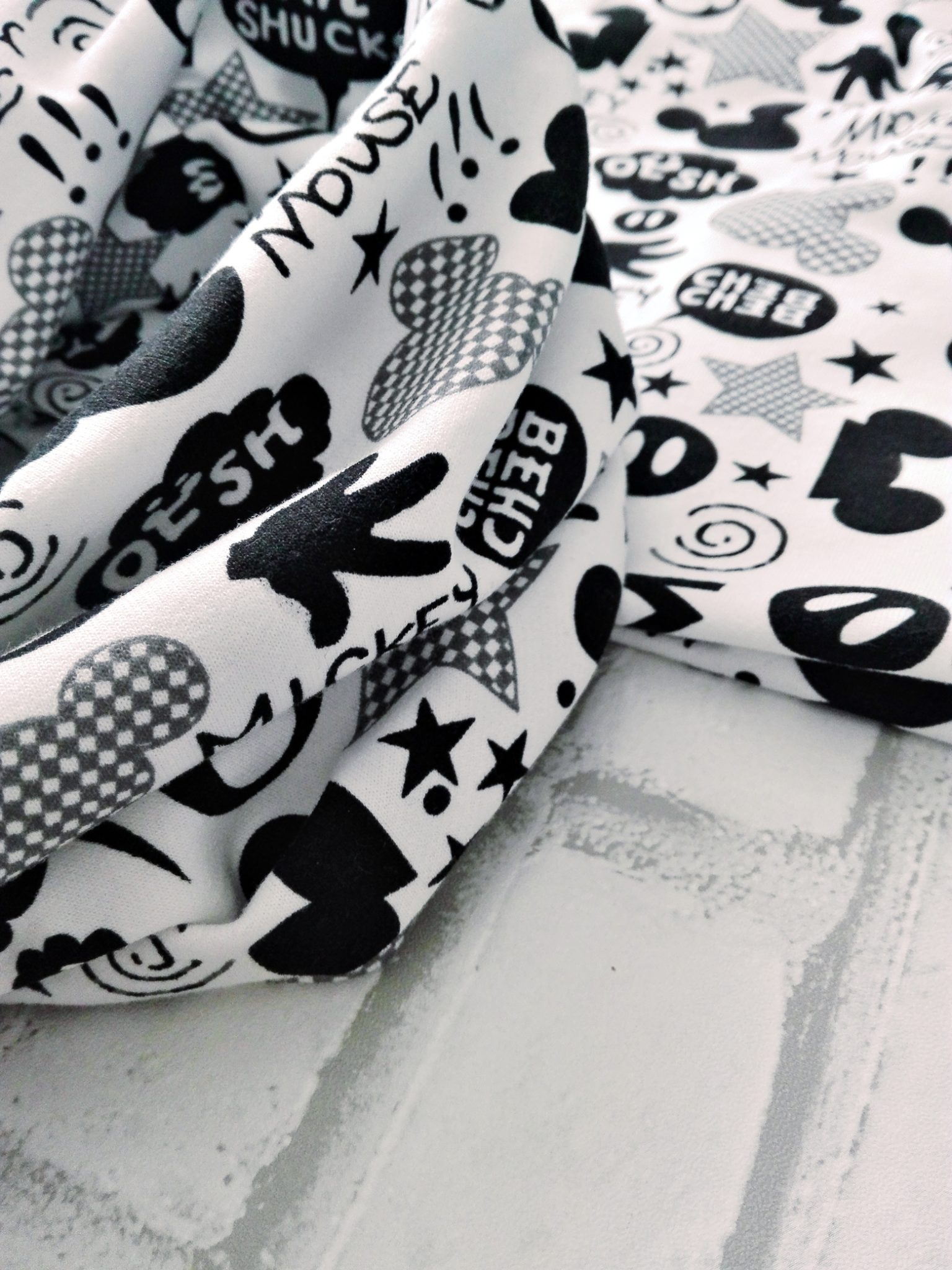 O ile pamiętałam, jak obchodzić się z czystą bawełną – dzianiny nie miałam w ręce tak dawno, że do szycia podchodziłam jak do jeża, naprawdę. Wielokrotnie sprawdzałam wszystko, przekręcałam, spinałam, a nawet wracałam do swoich blogowych tutoriali, aby upewnić się czy niczego nie pomyliłam. Okazało się jednak, że nie taki diabeł straszny, a mój syn stał się właścicielem wystrzałowego, wiosennego kompletu. Myszka Miki otuli jego szyję, głowę i nogi. Już nie mogę doczekać się, aż śnieg i mróz wreszcie odpuszczą, a za oknem zrobi się cieplej, by mógł wreszcie założyć ten komplet.