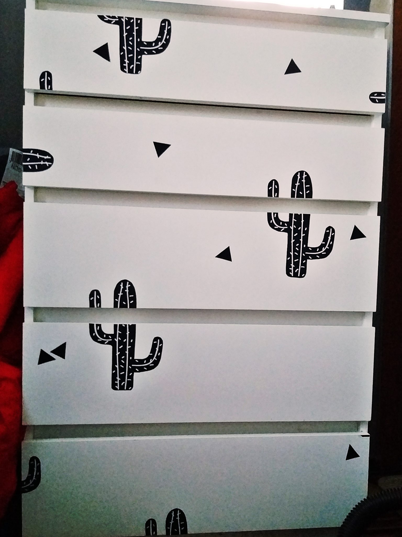 Fototapetę zamawiałam o kilka centymetrów dłuższą i szerszą z racji tego, że ściany w moim bloku są strasznie krzywe i gdybym pokusiła się o zamówienie jej typowo na wymiar – skończyłoby się to katastrofą. Tym sposobem zostało mi kilka elementów ze wzoru, które dokładnie wycięłam i przykleiłam na swoją wysłużoną już nieco komodę. Przyznam, że kiedy zaczęłam naklejać kaktusy i trójkąty – to naprawdę nie spodziewałam się tak satysfakcjonującego efektu.