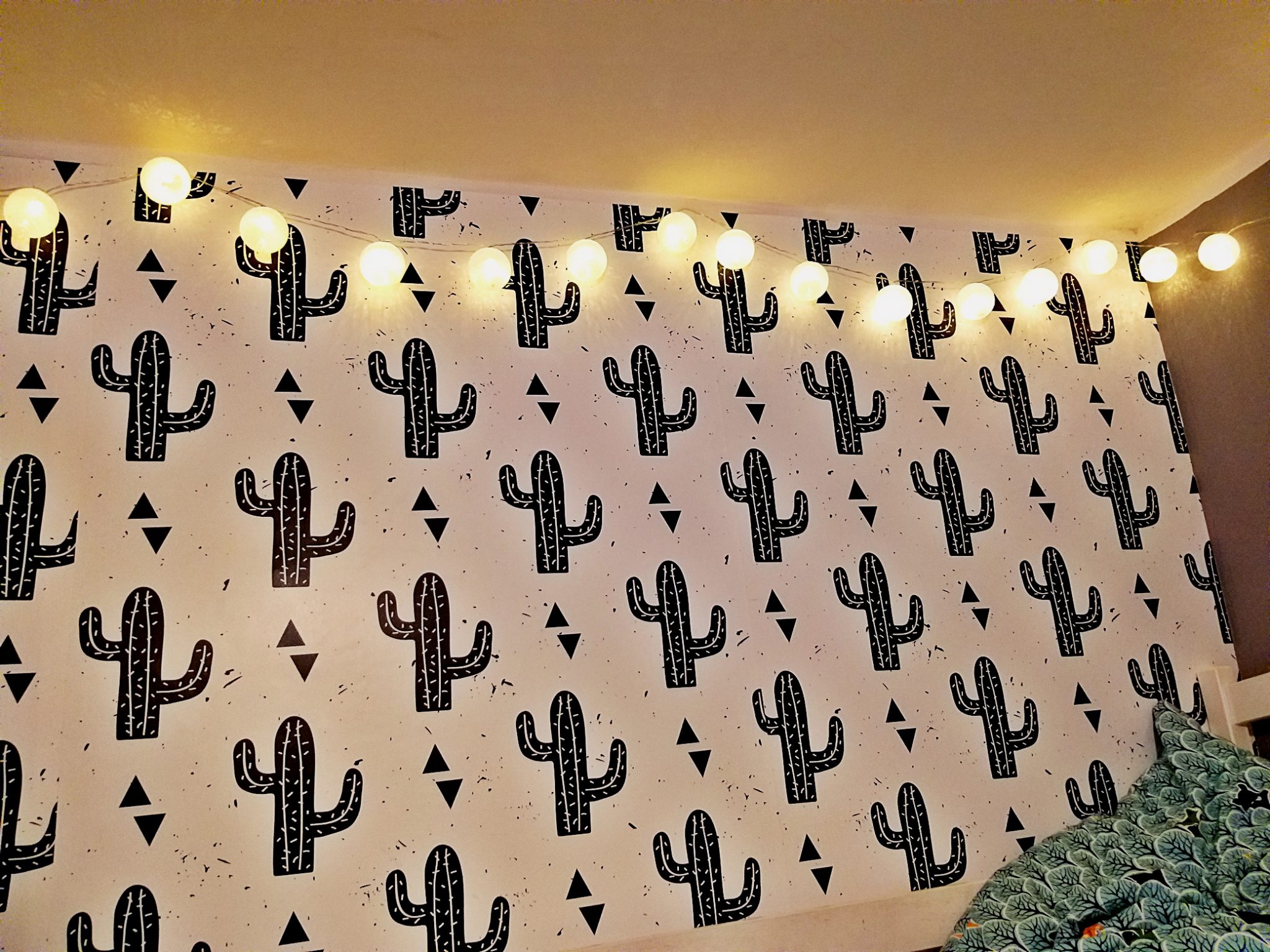 Początkowo myślałam, że to koniec kaktusowego szaleństwa z fototapetą, jednak wciąż czegoś mi brakowało. Dokupiłam więc białą girlandę z lampkami i przyczepiłam ją na łączeniu sufit-ściana. Sądzę, że nadało to całości odrobiny ciepła!