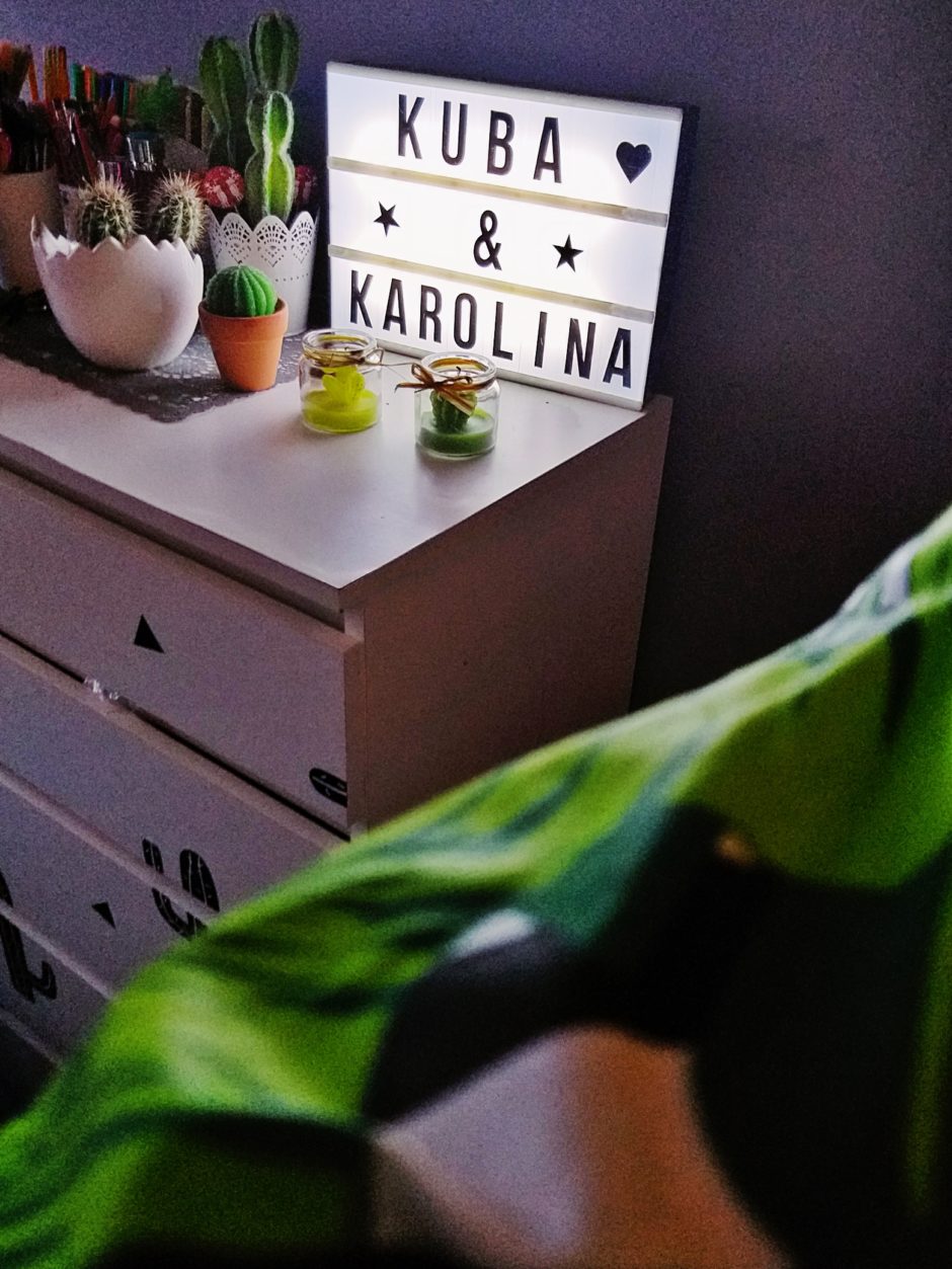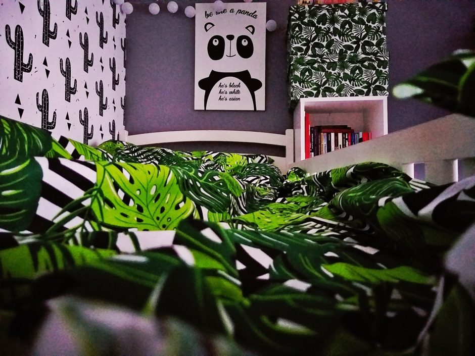 Nie było, nie jest i chyba nigdy nie będzie tajemnicą fakt, że uwielbiam częste zmiany w naszym sypialnym kąciku. Ogromną radość sprawia mi samodzielne szycie pościeli i dodatków czy przyklejanie fototapety. Od czasu do czasu całkowicie zmieniam wystrój, w efekcie czego całość nie przypomina tego, czym była wcześniej. Pewnie część z Was pamięta naszą ścianę w delikatne strzałki, którą fajnie uzupełniały marynarskie pościele – dziś po tym motywie nie ma już najmniejszego śladu. Później miał miejsce okres panowania pand, jednak z uwagi na zbyt duży kontrast postanowiłam do wszystko nieco stłumić przy jednoczesnym zachowaniu naszej miłości do tego słodkiego zwierzaka. Od jakiegoś czasu rządzą u nas kaktusy i wszystko co z nimi związane. Najpierw pojawiły się te doniczkowe, potem różnego rodzaju kaktusowe dekoracje czy gadżety codziennego użytku. Z końcem roku przyszedł czas na kaktusową ścianę, a sam motyw liści i zieleni stawał mi się coraz bliższy. W efekcie tego wszystkie w naszym kąciku (a właściwie mojej bazie!) królują trzy kolory: czerń, biel i zieleń.