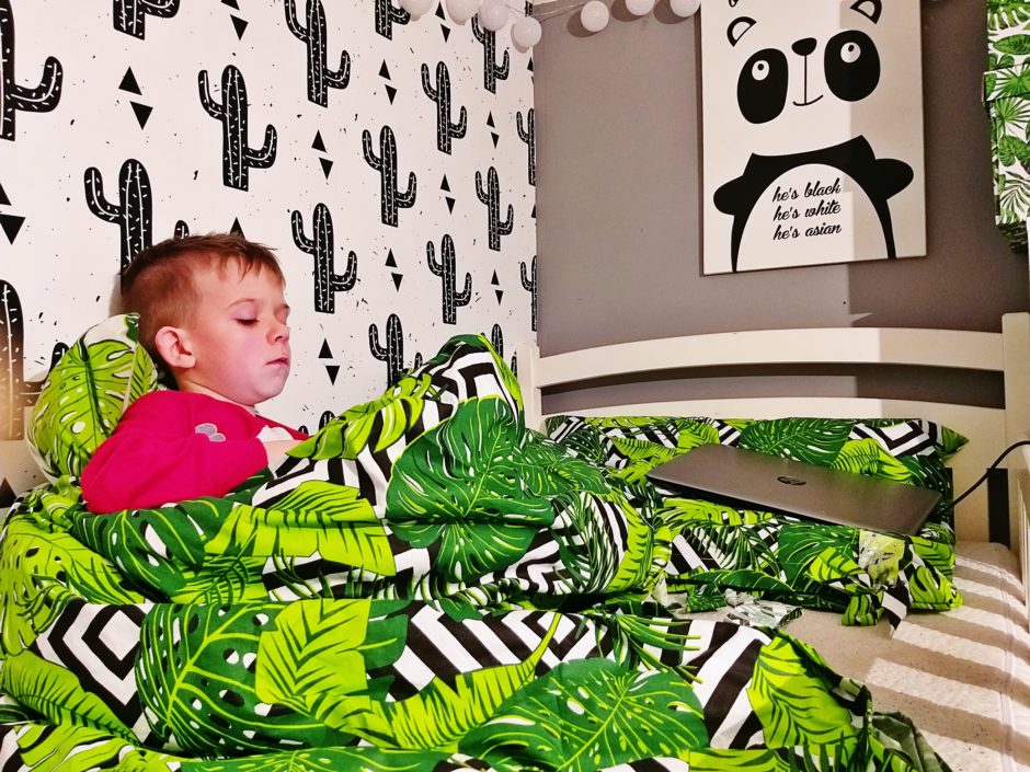Doszłam do wniosku, że przy okazji wymiany własnych poszewek – uszyję również coś nowego dla Kuby. Początkowo miały to być „miętowe kaktusy„, jednak szybko wybiłam sobie samej ten pomysł z głowy. Dlaczego? Niech pierwsza kamieniem rzuci ta, której dziecko nigdy nie jadło niczego w łóżku? No właśnie, odpowiedź jest prosta. Ostatecznie Kuba bawełnę wybrał sam i zdecydował się na „miętowe akuku w lesie miś i szop„. Jednak z racji tego, że ostatnimi czasy mały królewicz znów woli spać w moim łóżku, jego pościel czeka gotowa na odpowiedni czas. Z kolei pół metra przepięknej tkaniny w kaktusy wciąż czeka na moją decyzję – wciąż nie mogę zdecydować czy uszyć z niej worek na buty dla Kuby czy poszewkę na deskę do prasowania.